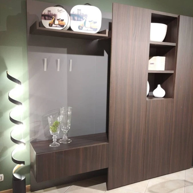 Ogni elemento del sistema è stato progettato per garantire la massima praticità. Le ante battenti e i cassetti sospesi con apertura push and pull offrono un’esperienza d’uso fluida e intuitiva, mentre i vani aperti e chiusi permettono di organizzare al meglio gli oggetti di uso quotidiano. Particolarmente interessante è il vano con vassoio inclinato, pensato appositamente per l’utilizzo come scarpiera, una soluzione intelligente per mantenere l’ordine all’ingresso.