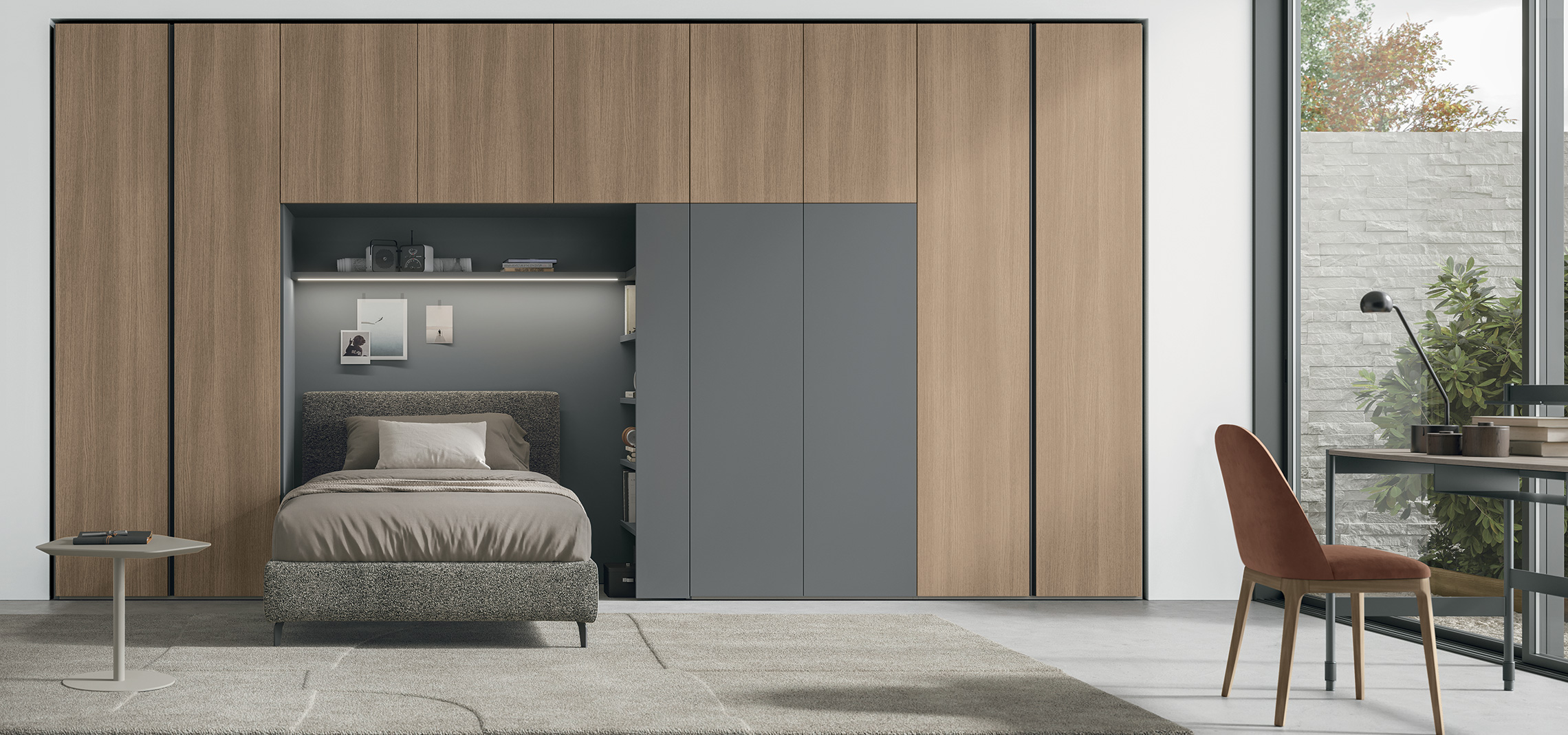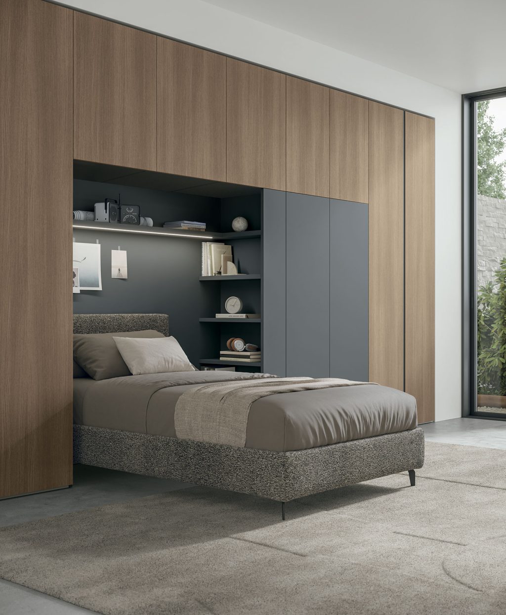 Il ponte centrale è l’elemento che caratterizza questa soluzione. Può essere utilizzato come mensola, come spazio contenitivo aggiuntivo o come supporto visivo sopra il letto. La sua presenza permette di recuperare spazio prezioso in modo semplice e discreto, senza ingombri e senza rinunciare all’armonia estetica dell’ambiente.