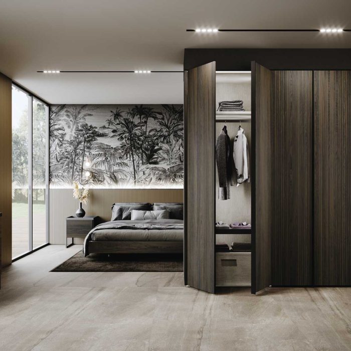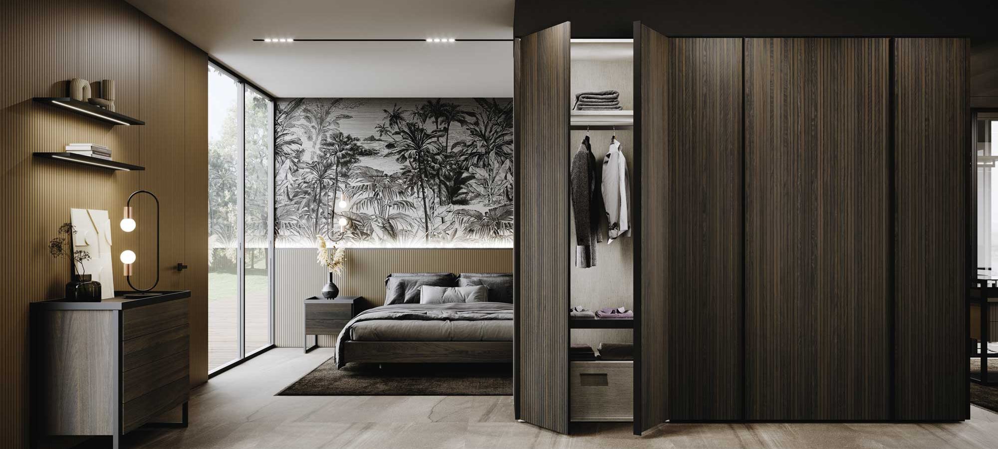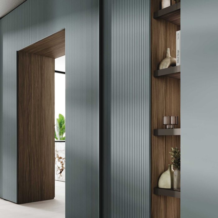 L’anta dell’armadio Always ha una riga verticale di passo 2 cm ed è realizzata in versione laccato con doghe in tinta e impiallacciato legno con doghe nere.