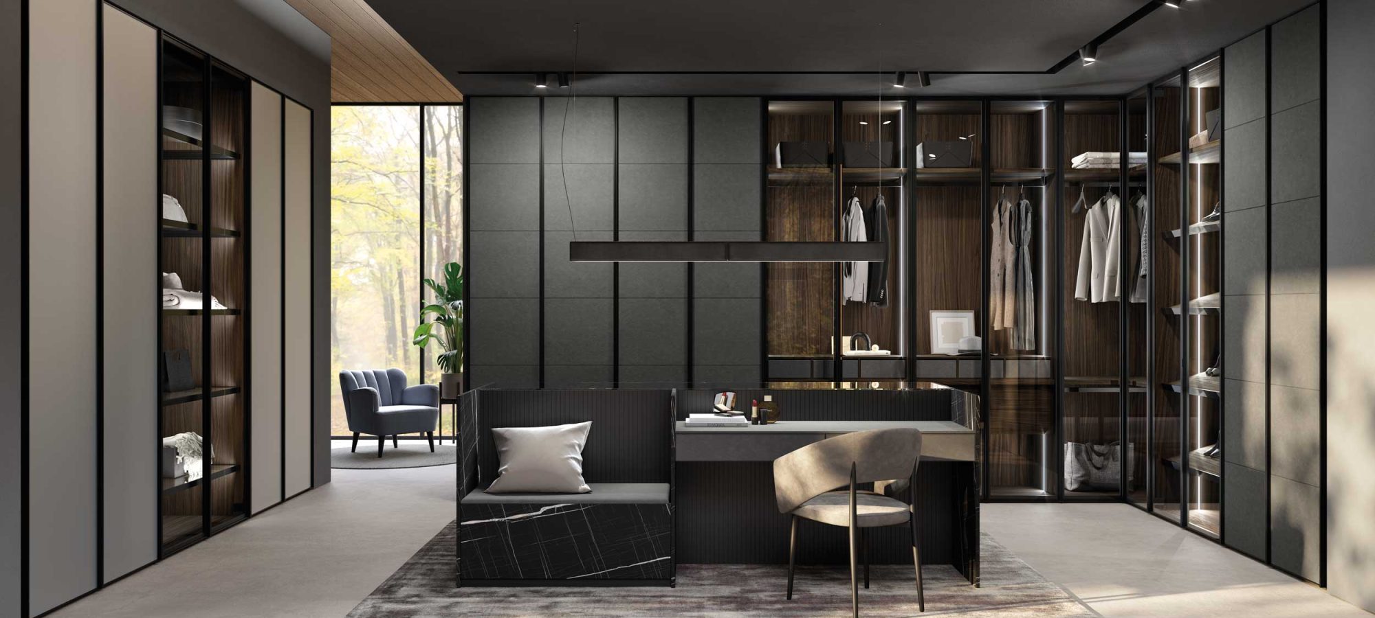 La sua apertura a 180° è garantita da cerniere soft-closing nascoste. Internamente, la struttura può essere personalizzata su misura per adattarsi perfettamente alle esigenze di spazio e organizzazione.