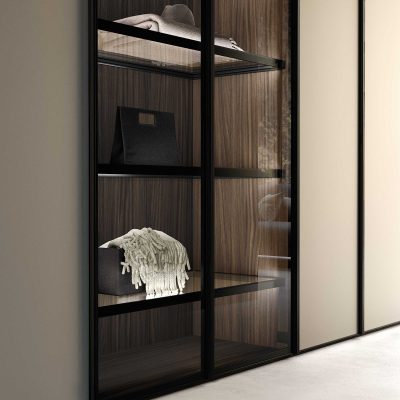 L’armadio Shine di Guzzini & Fontana è una sintesi sofisticata di trasparenza e struttura: il telaio è in alluminio opaco nero, mentre le ante possono essere in vetro laccato Bronzo, vetro trasparente fumé oppure in eco-pelle vintage nella finitura Pandora 10.