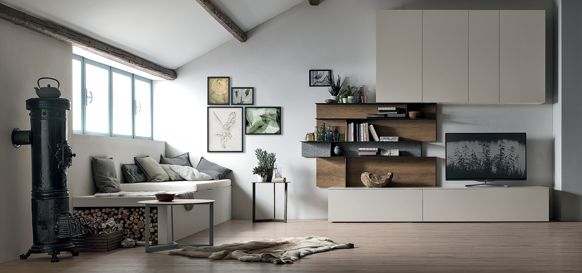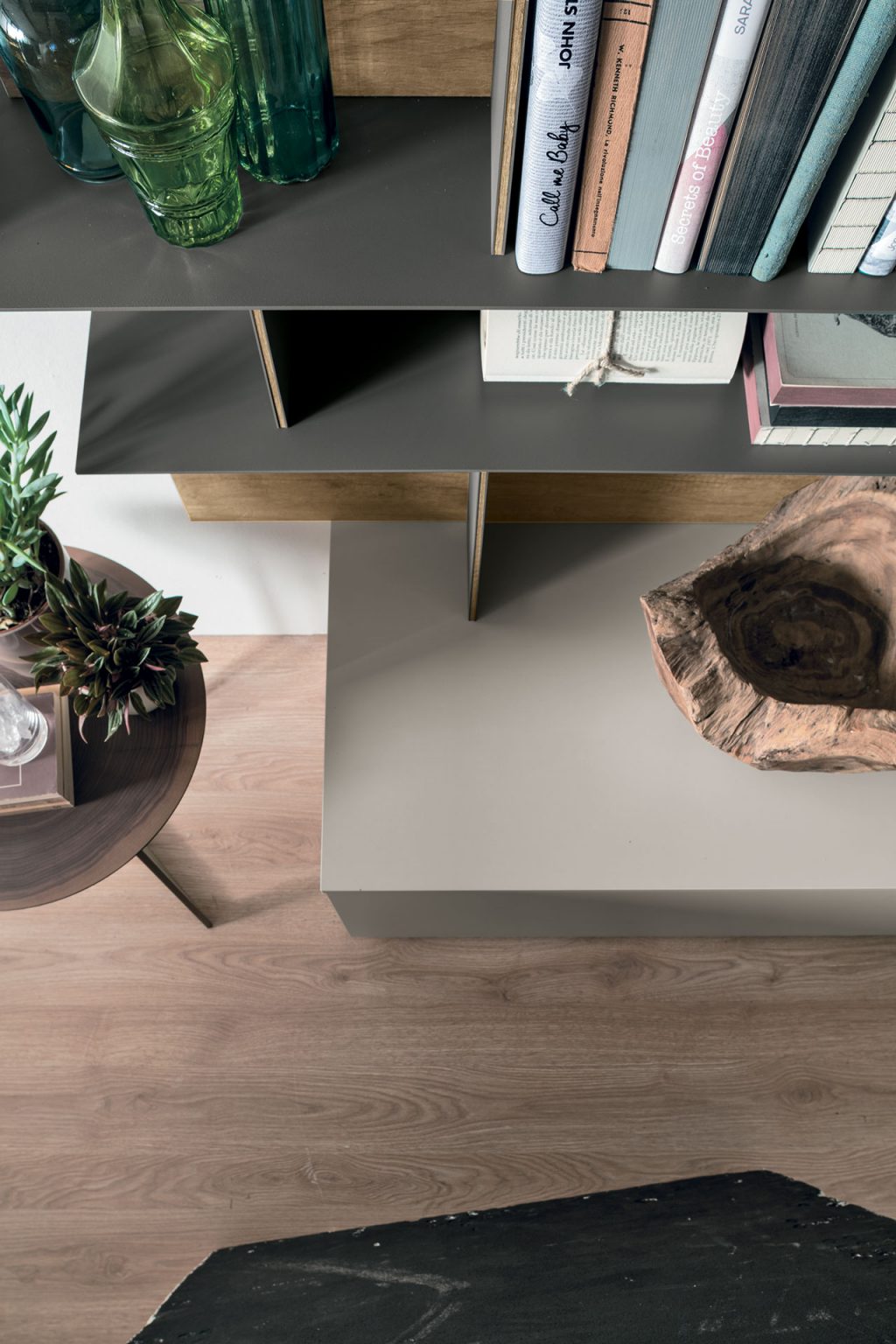 Grazie ai moduli a profondità variabili (22 / 30 / 51 cm), la parete gioca con pieni e vuoti, ottimizzando lo spazio senza sacrificare lo stile.