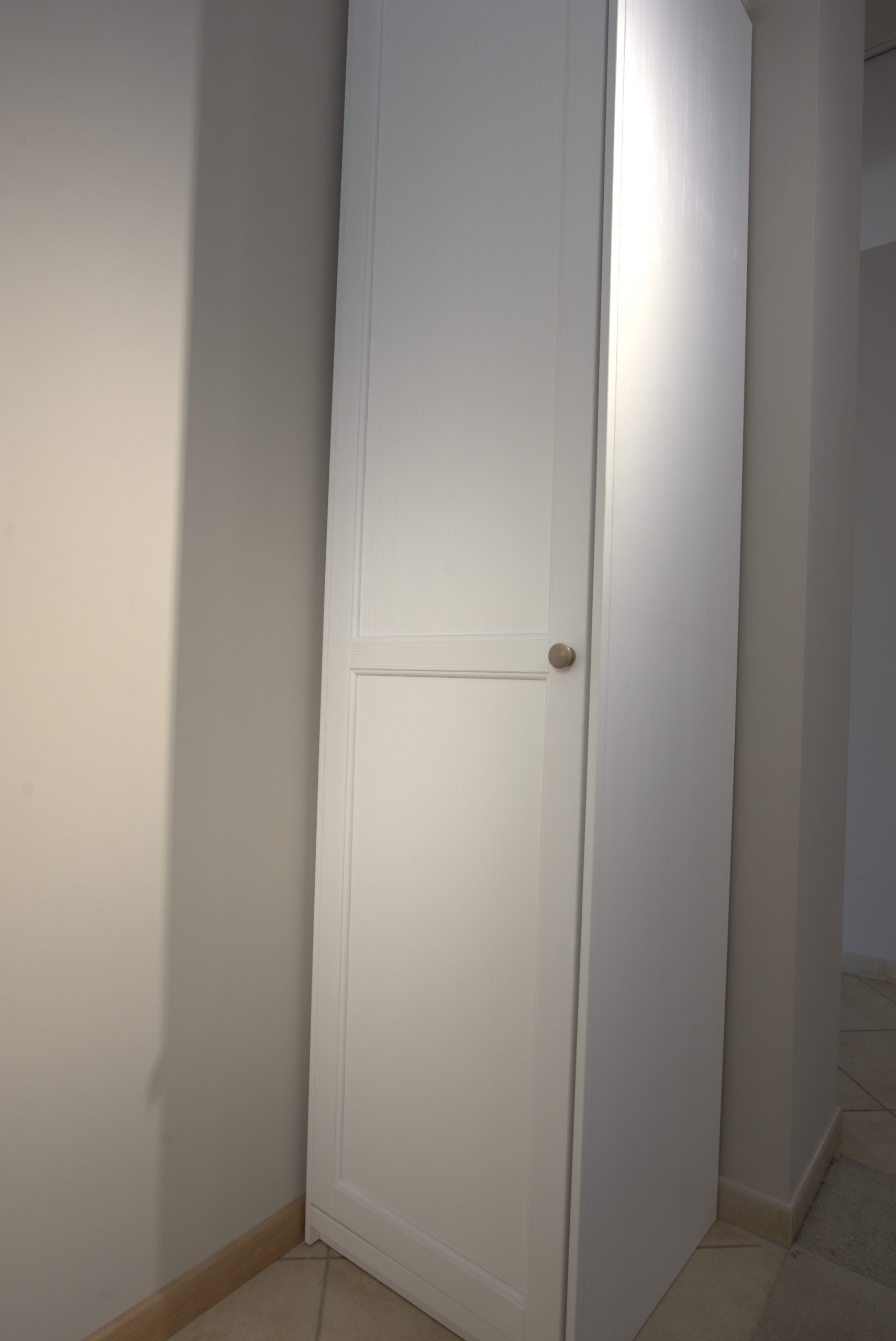 La composizione include armadi a colonna con anta battente, disposti ad angolo per sfruttare al meglio lo spazio, oltre a una colonna armadio aggiuntiva posizionata sulla parete opposta. Ampia capacità contenitiva, design essenziale e finiture coordinate.