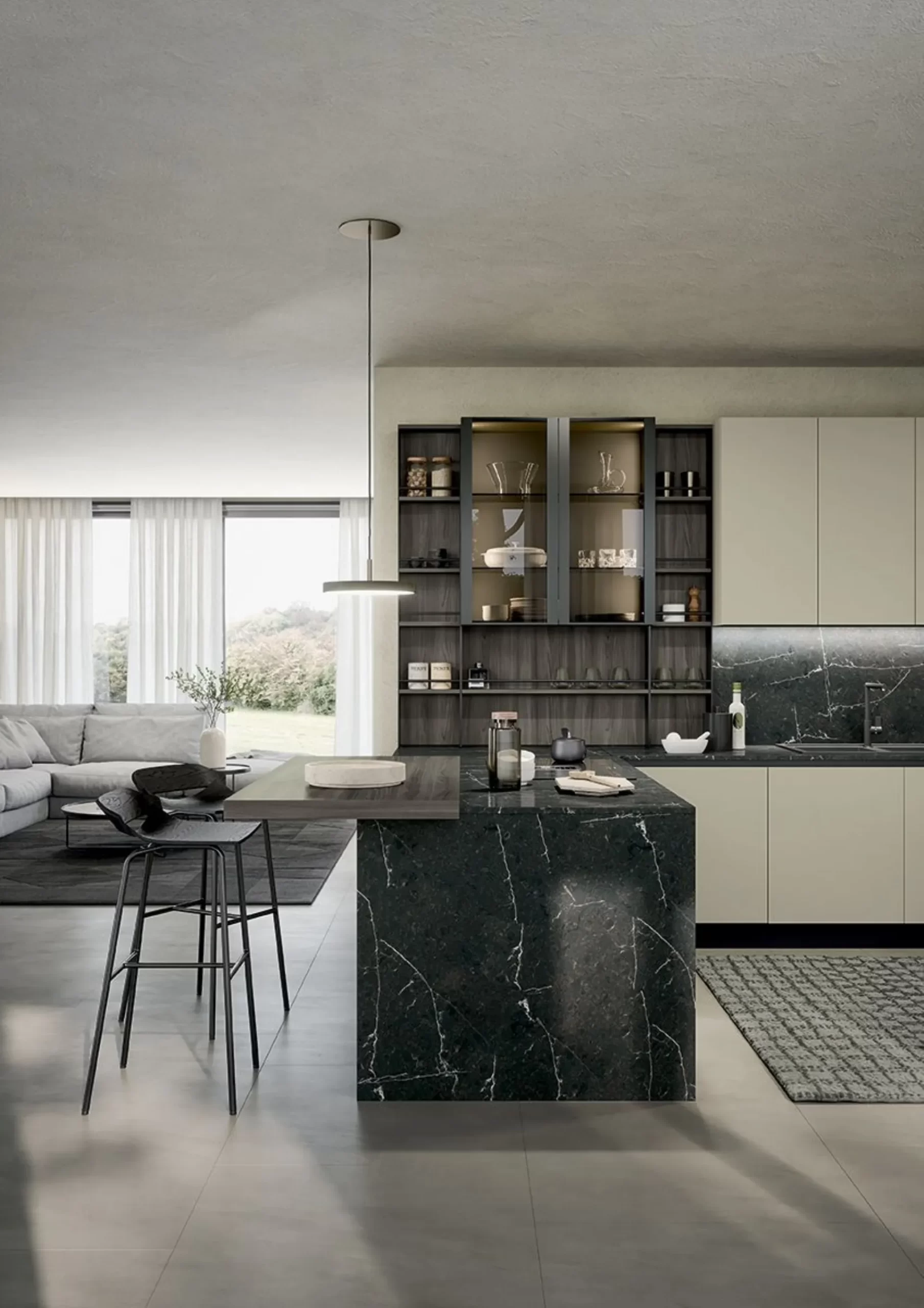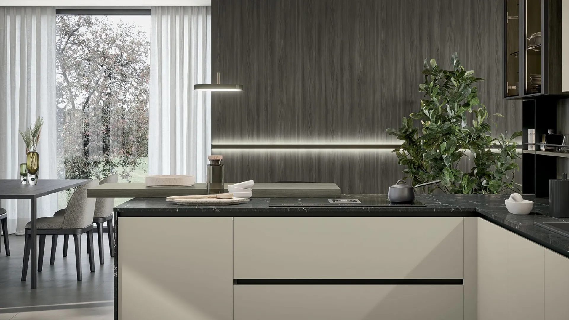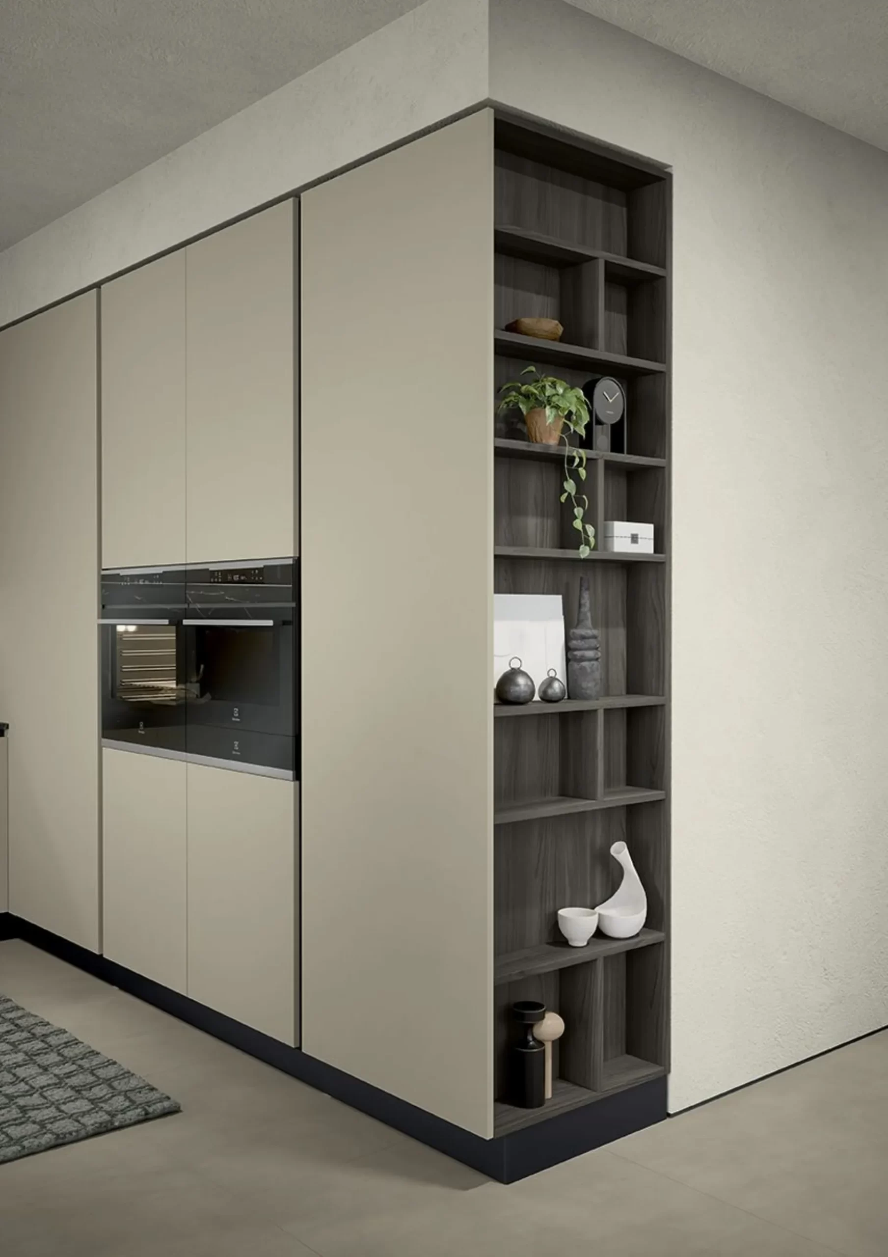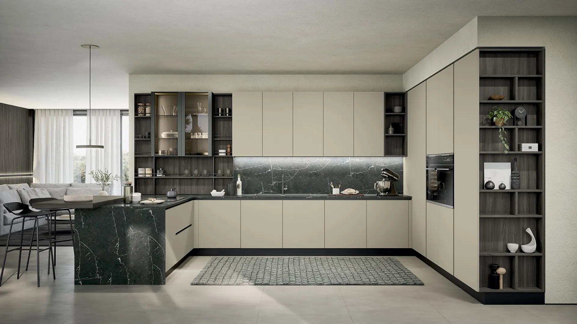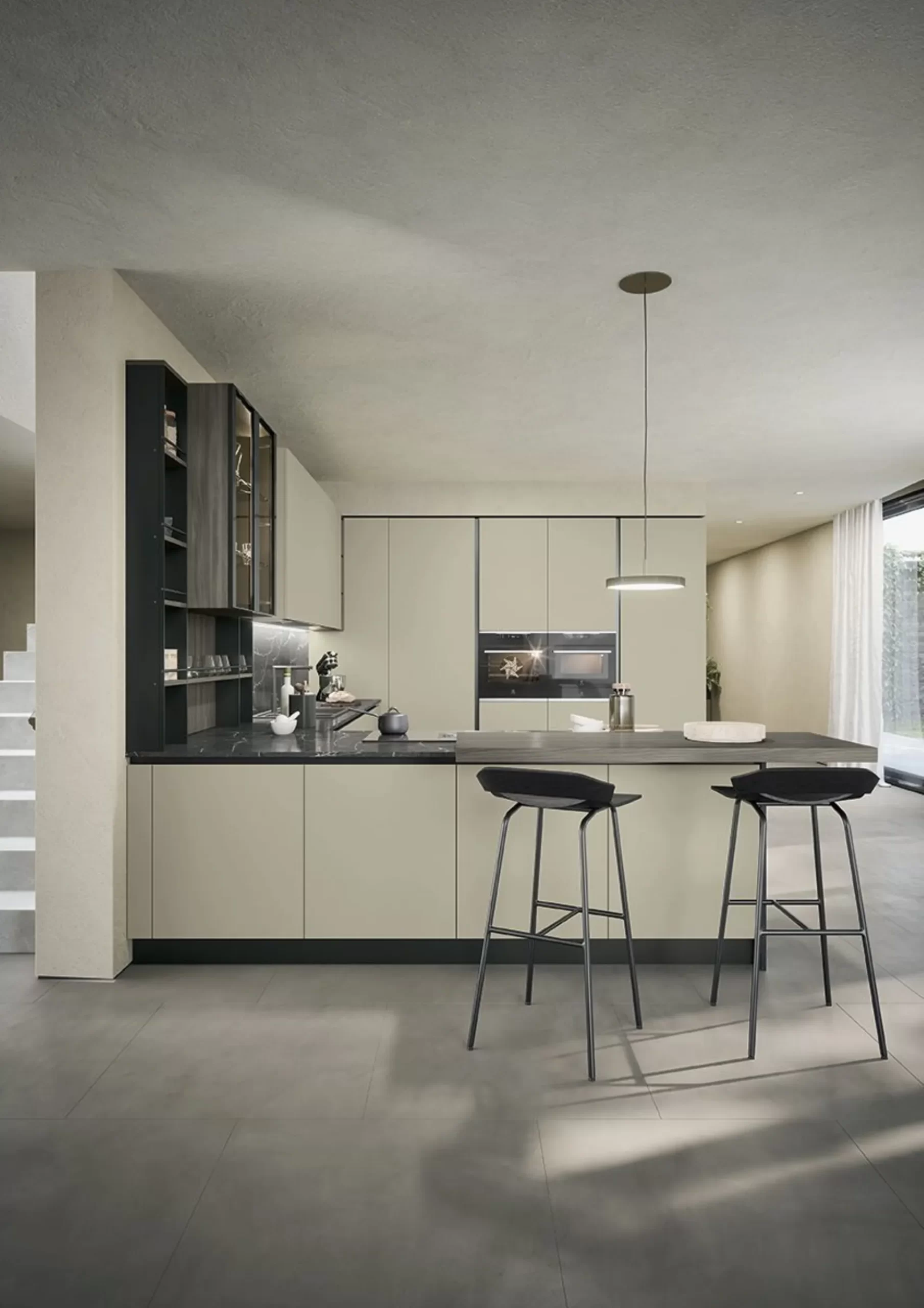 Il bancone a sbalzo offre una zona conviviale e pratica, perfetta per colazioni o spuntini rapidi, mentre il sistema attrezzato Vertical garantisce modularità e organizzazione.