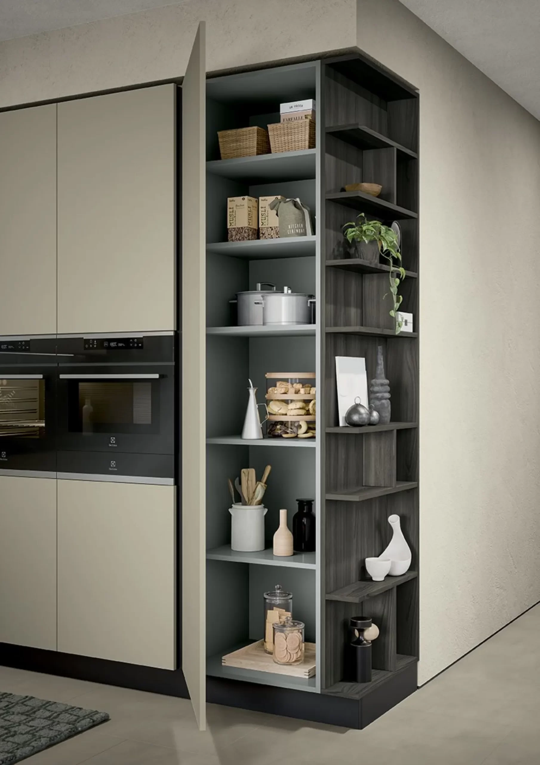 Infine, gole e zoccoli in finitura Lavagna conferiscono un dettaglio deciso e moderno.