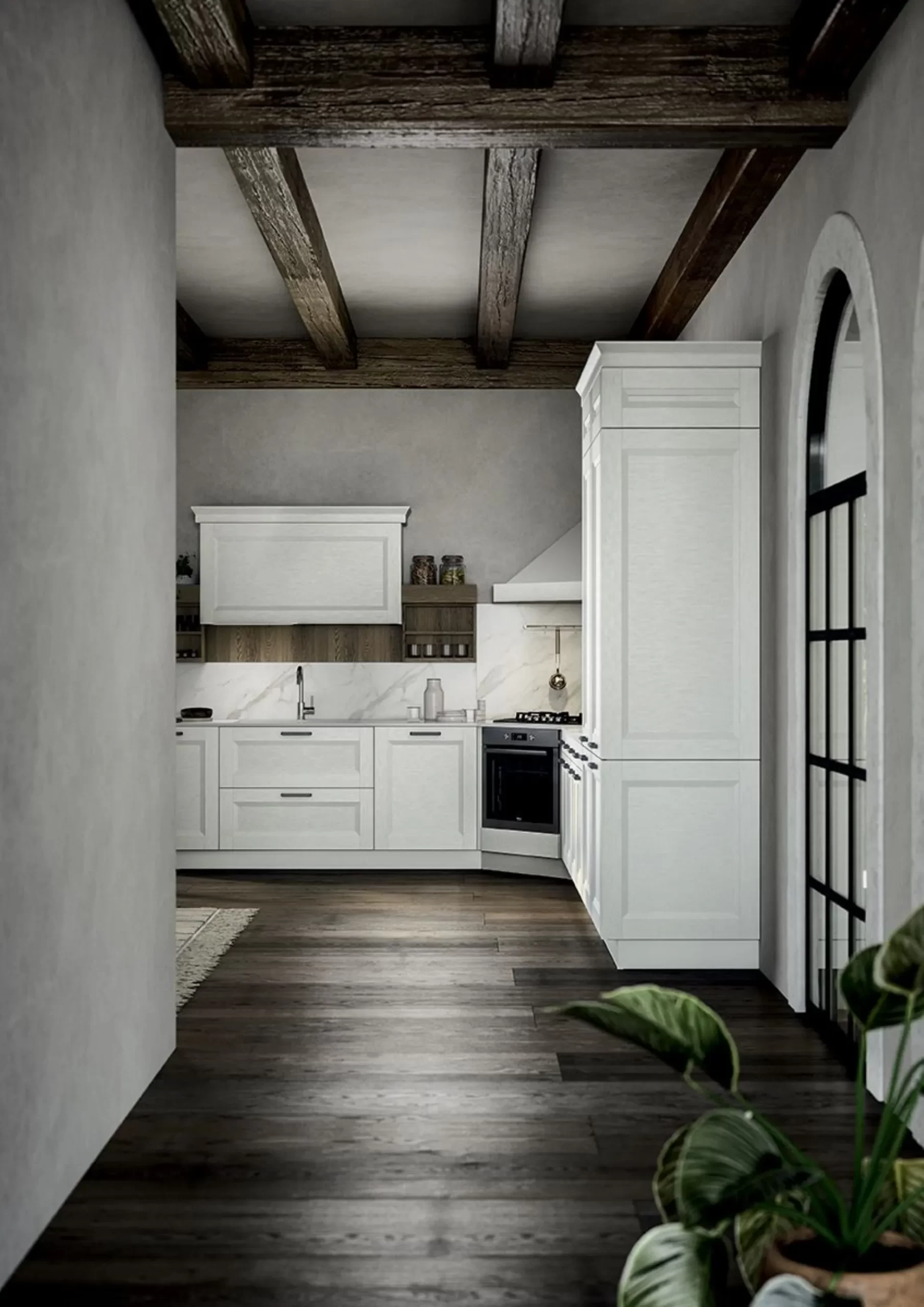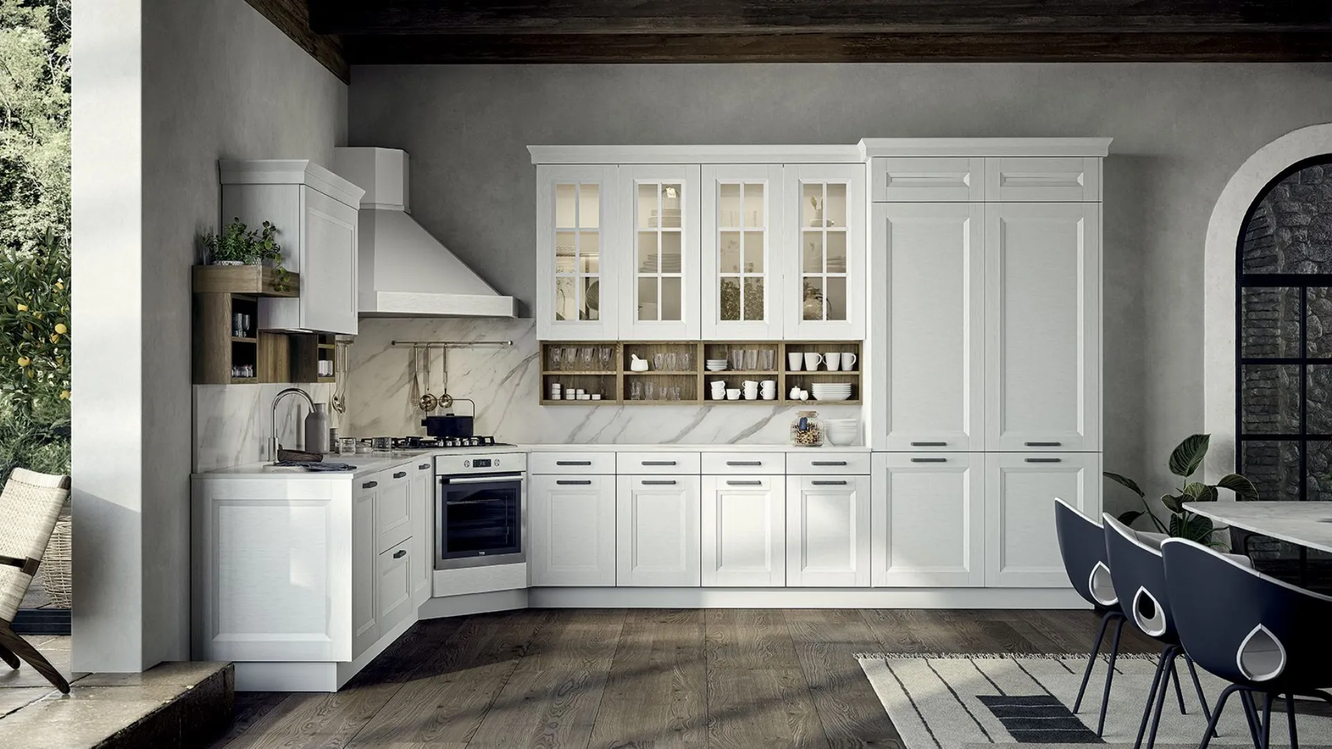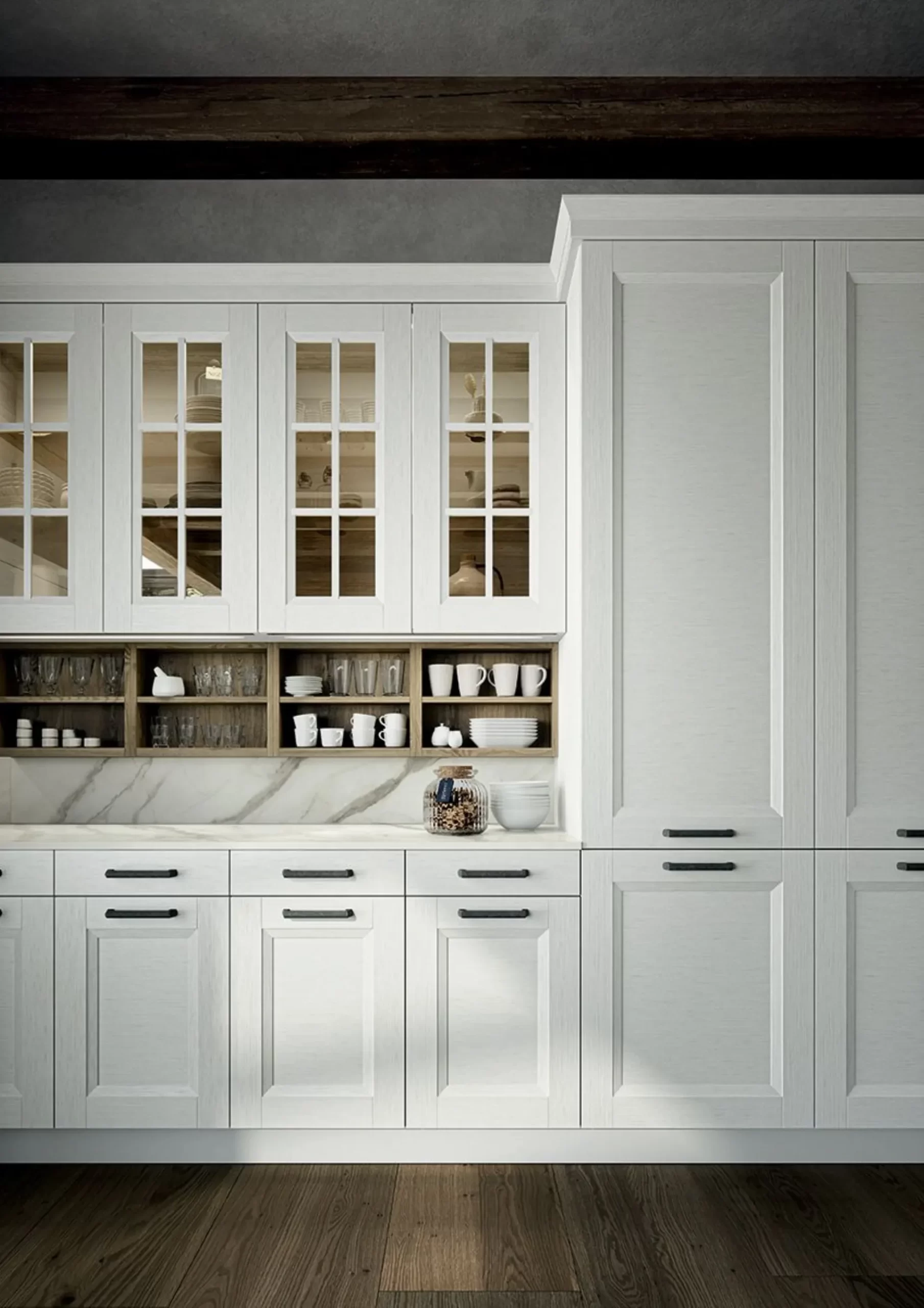 La Cucina Asia 02 unisce eleganza classica e funzionalità contemporanea. Le ante laccate Bianco Segnale illuminano lo spazio e il vano a giorno Fly introduce dinamicità visiva.