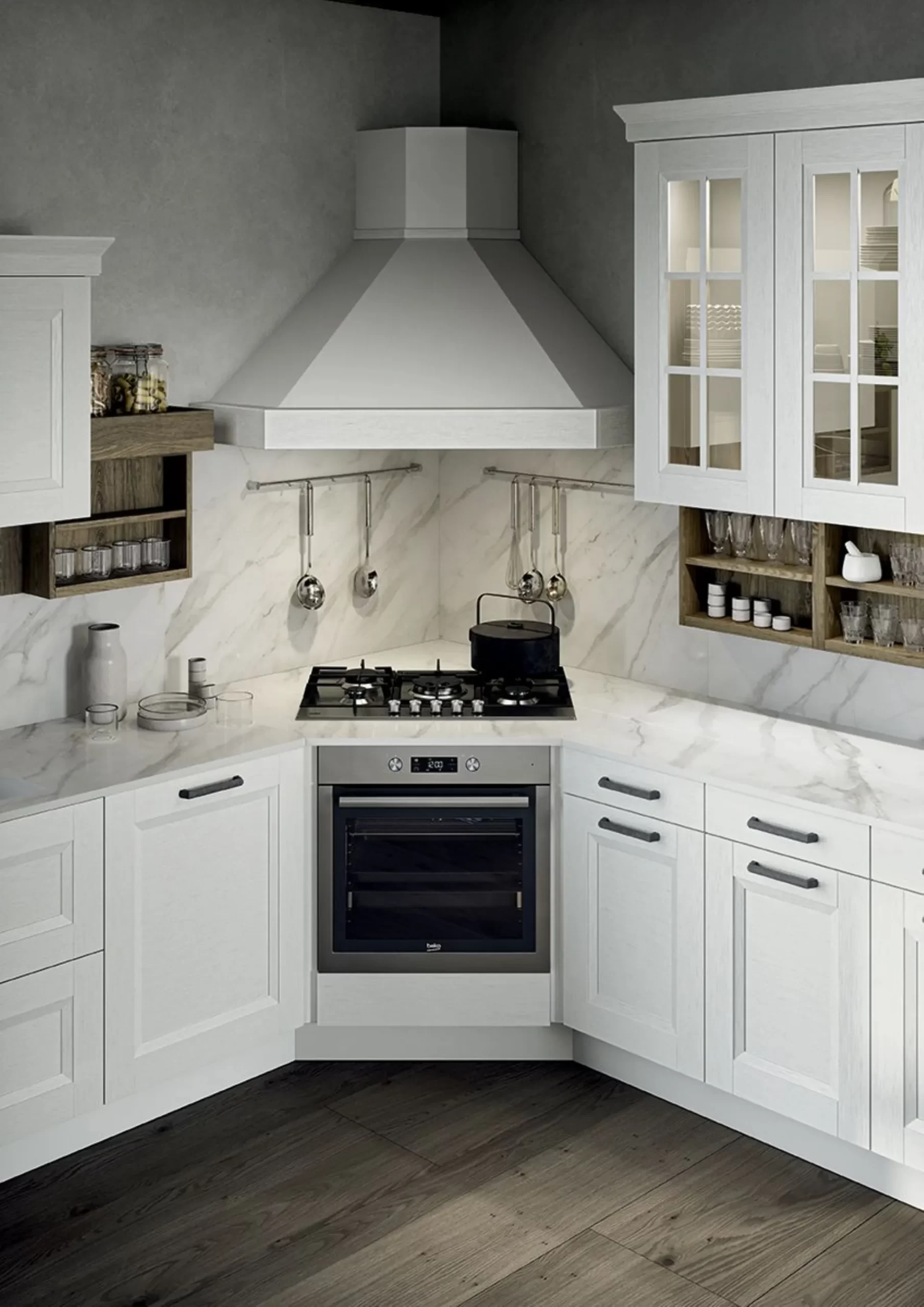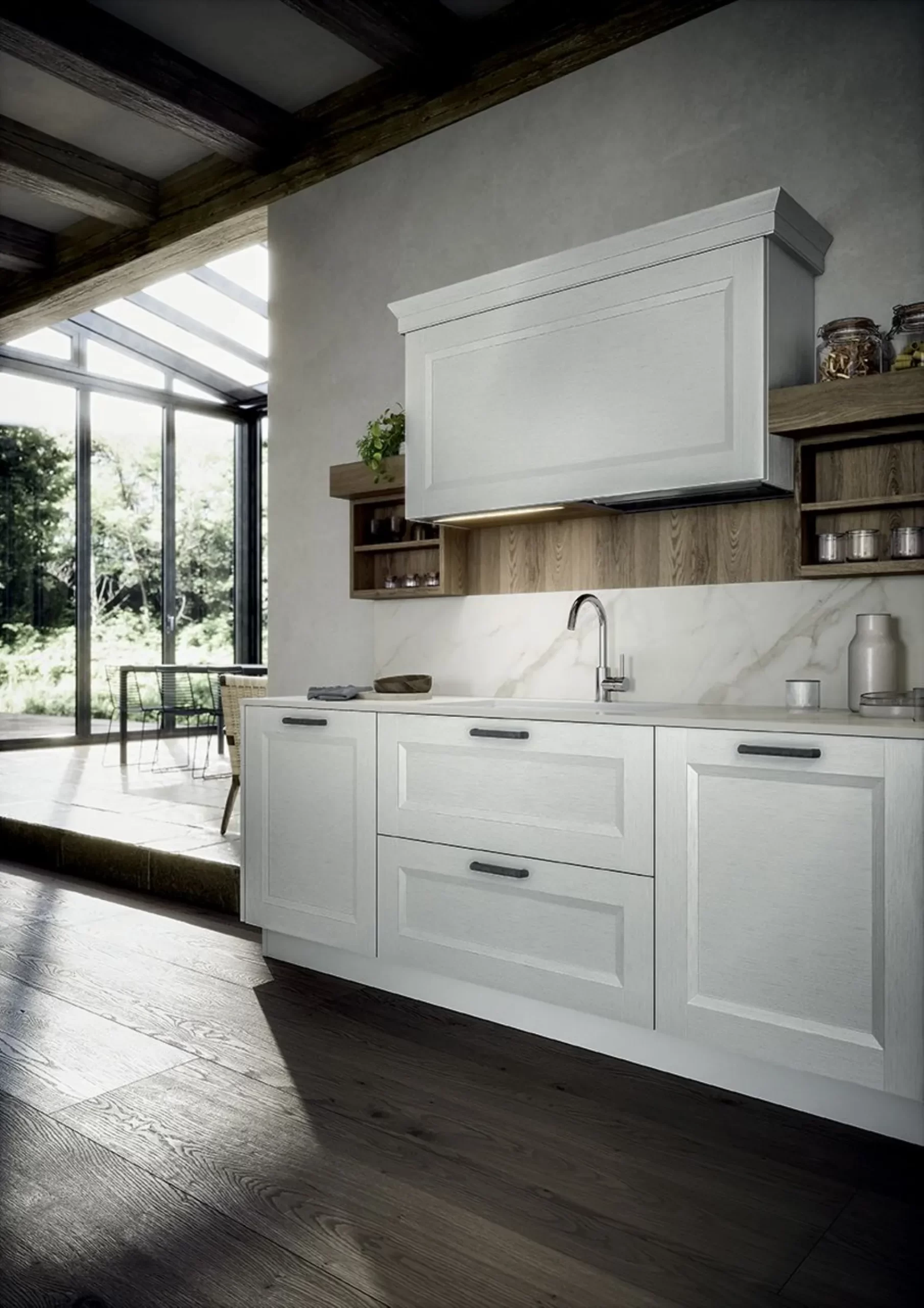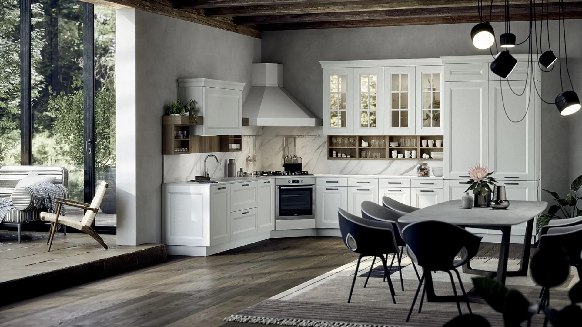 La Cucina Asia 02 unisce eleganza classica e funzionalità contemporanea. Le ante laccate Bianco Segnale illuminano lo spazio e il vano a giorno Fly introduce dinamicità visiva.