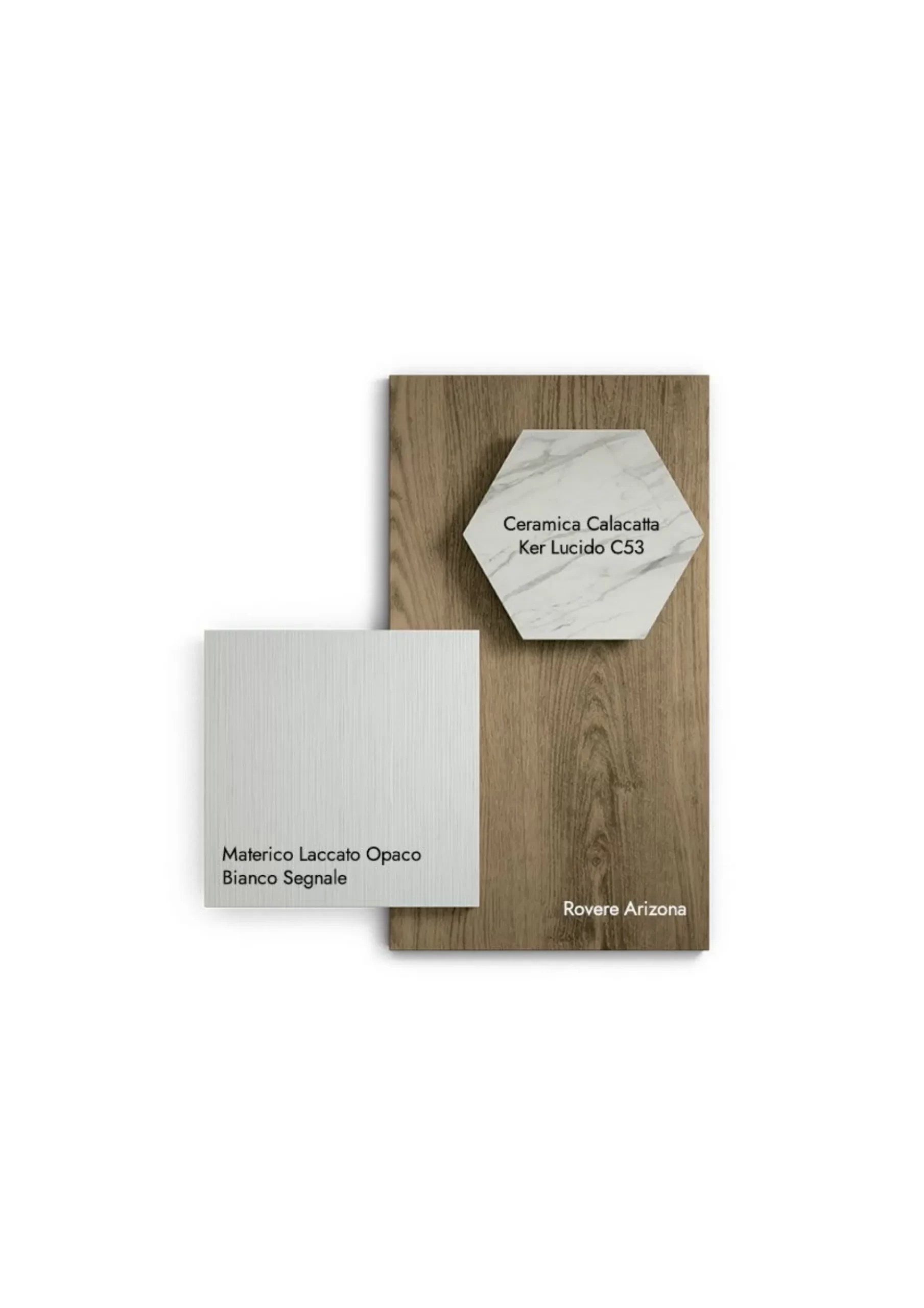 Il top e l’alzata in ceramica Calacatta Ker conferiscono una superficie resistente e raffinata.