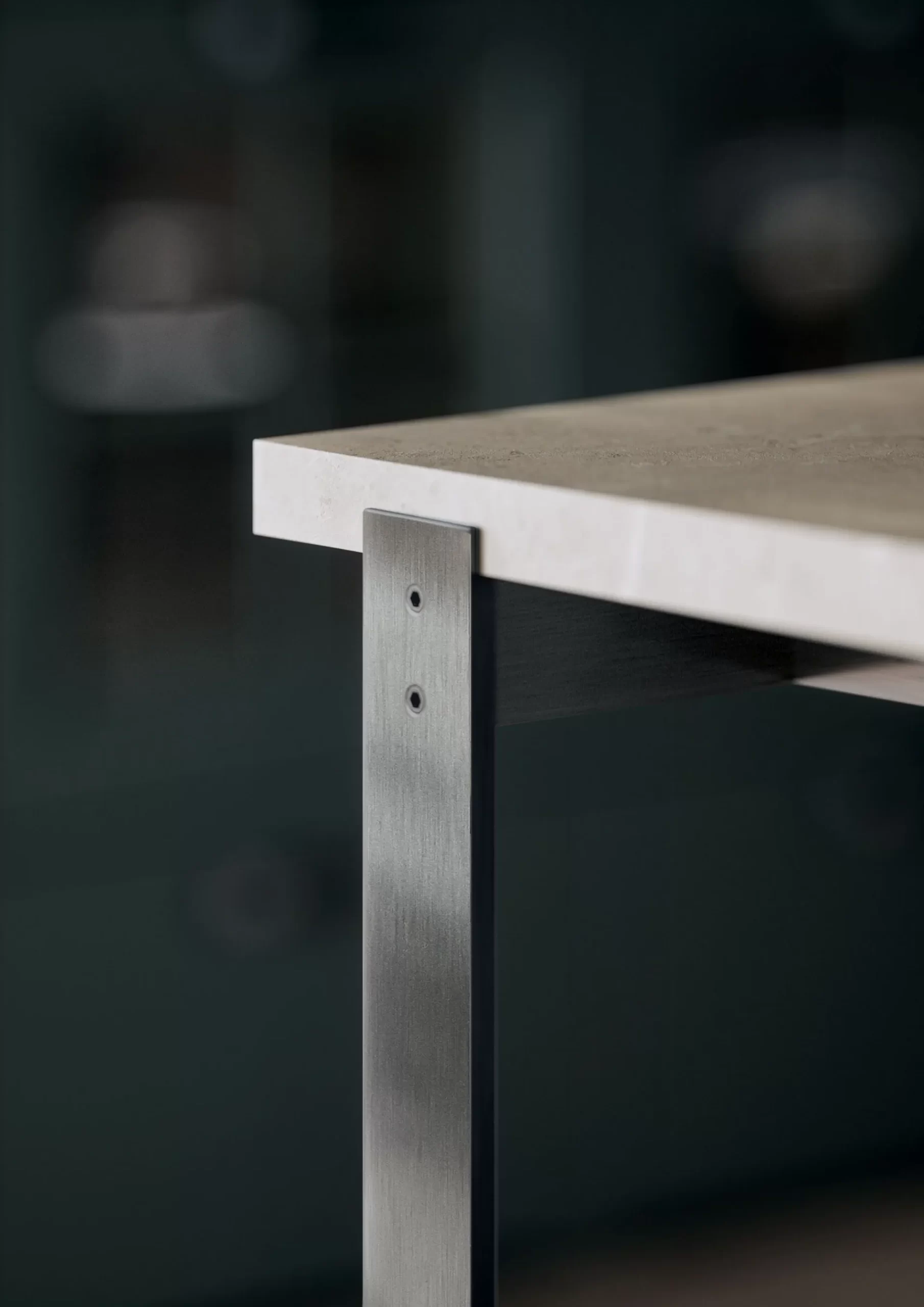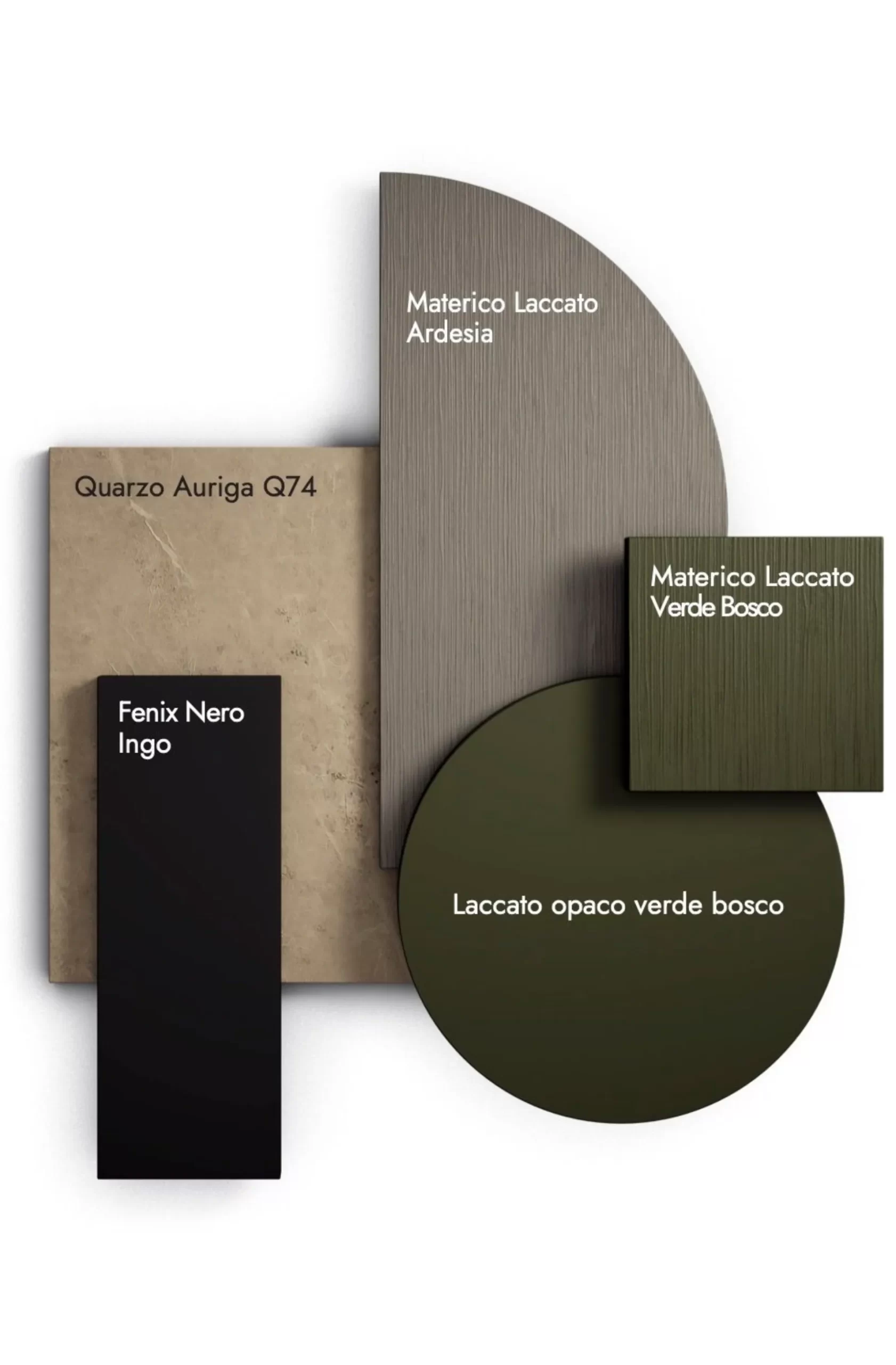 La boiserie in Fenix Nero Ingo protegge le pareti e aggiunge profondità, mentre il top in Pietra Grigia Naturale dona un tono sofisticato.
