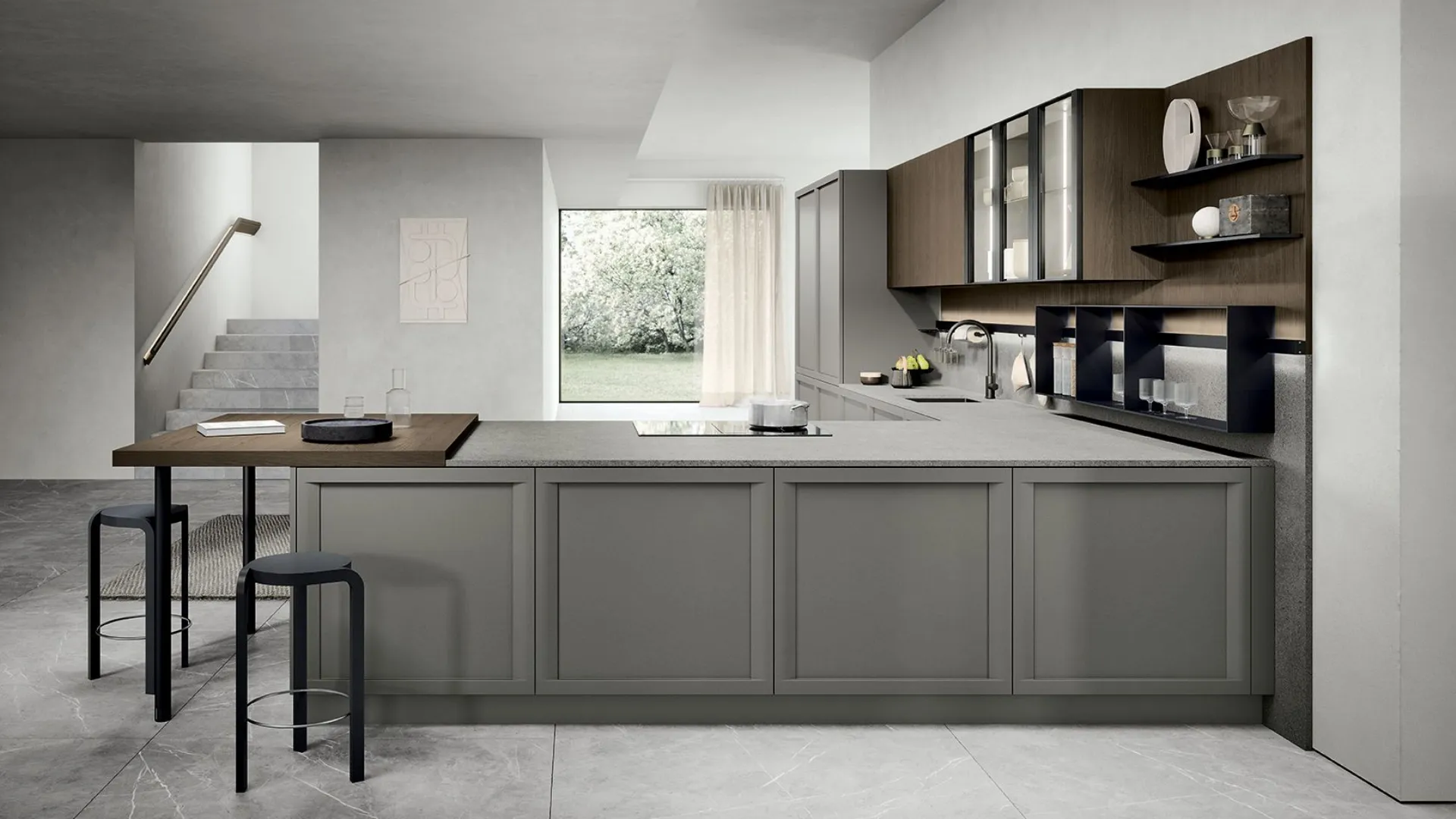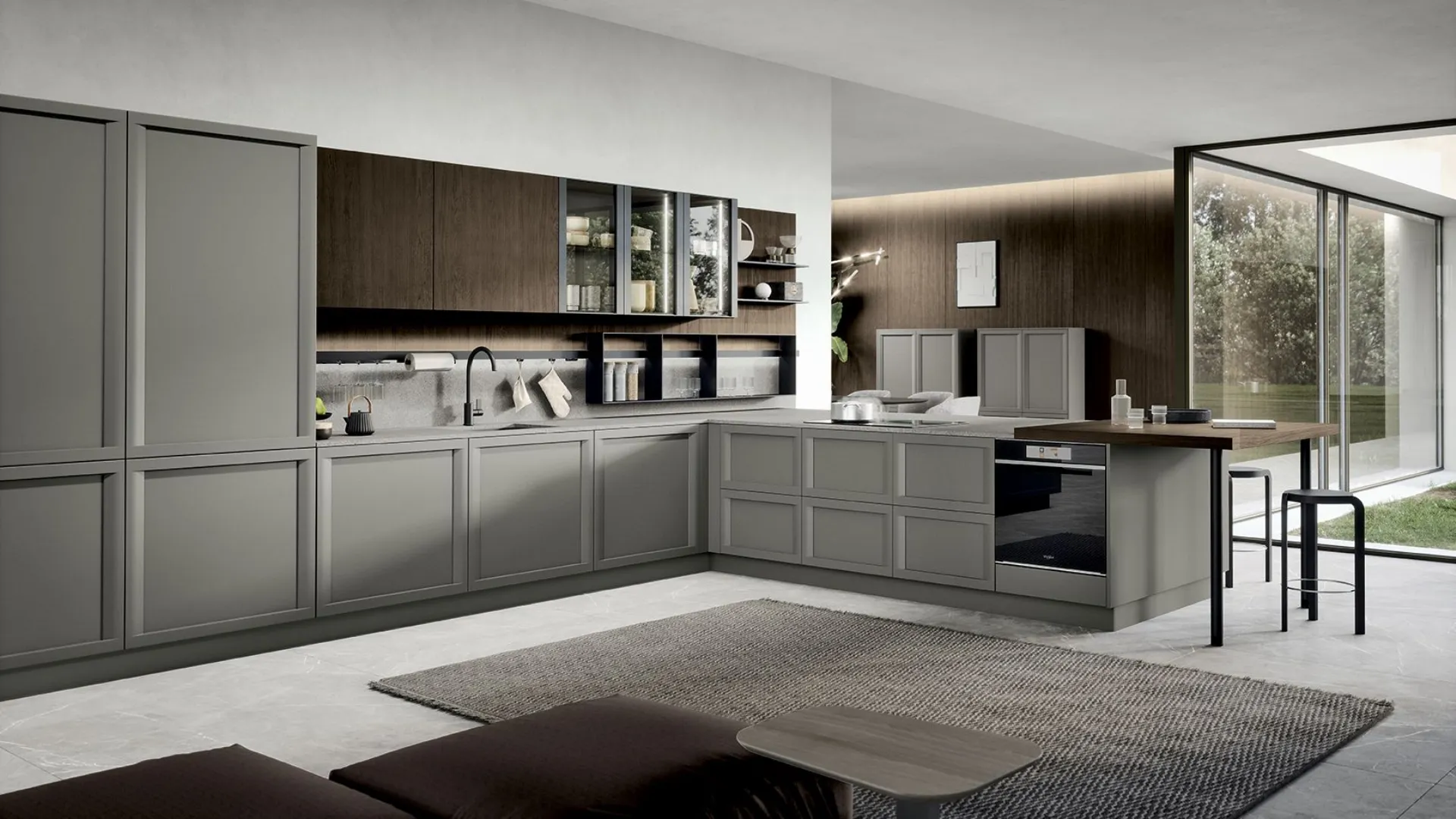 La Bellaria 02 di Forma Cucine unisce stile delicato e grande funzionalità. Le basi e le colonne hanno ante a telaio laccato Ardesia, abbinate a pensili in Rovere Duomo che donano calore.