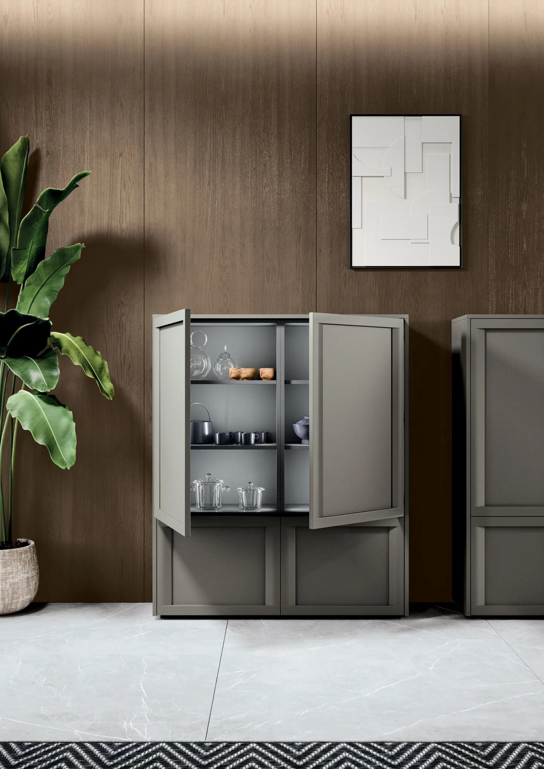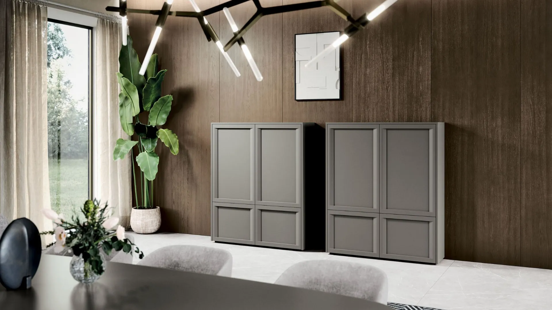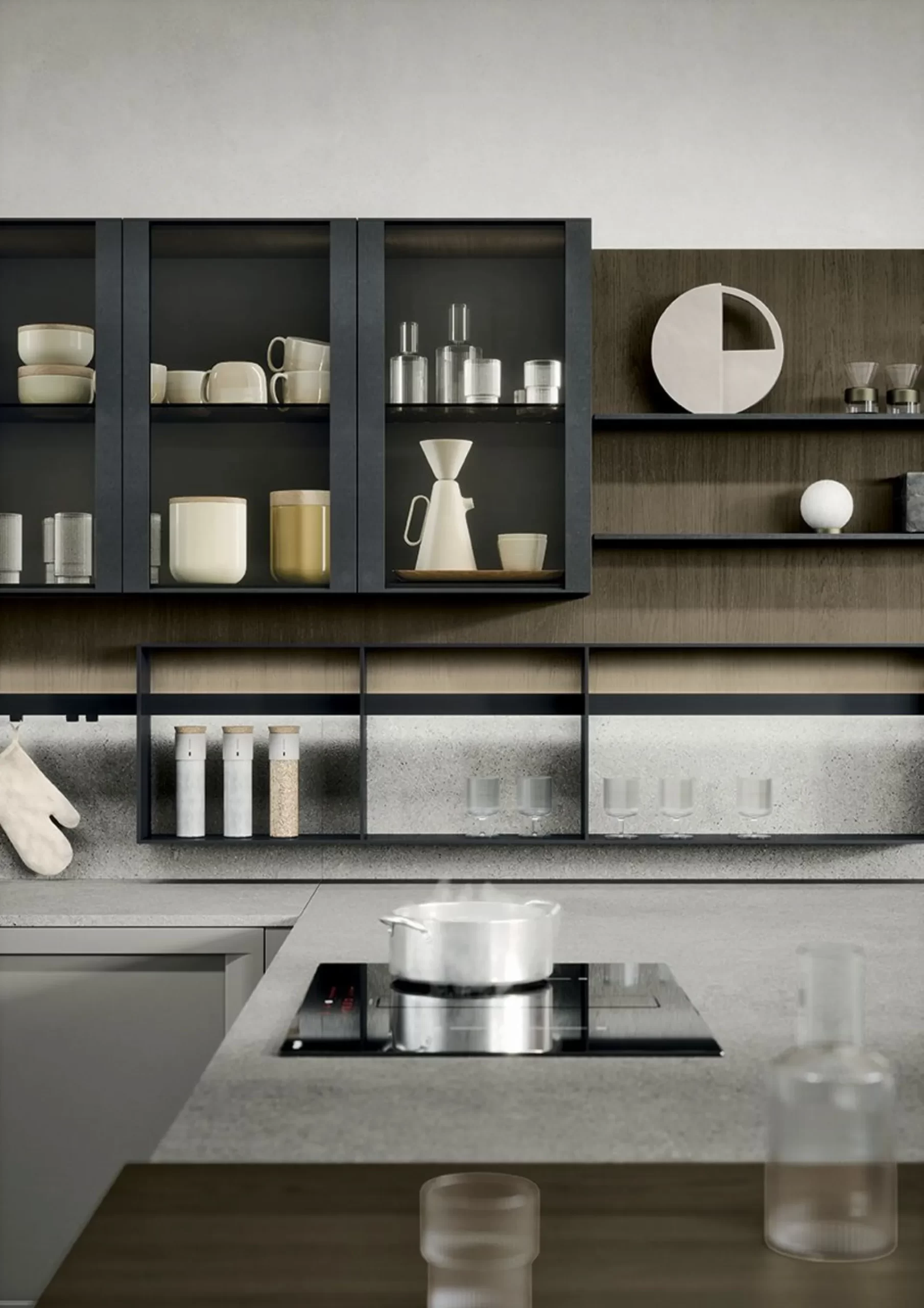 Le ante vetrate in alluminio nero con vetro fumé aggiungono un dettaglio raffinato e contemporaneo.