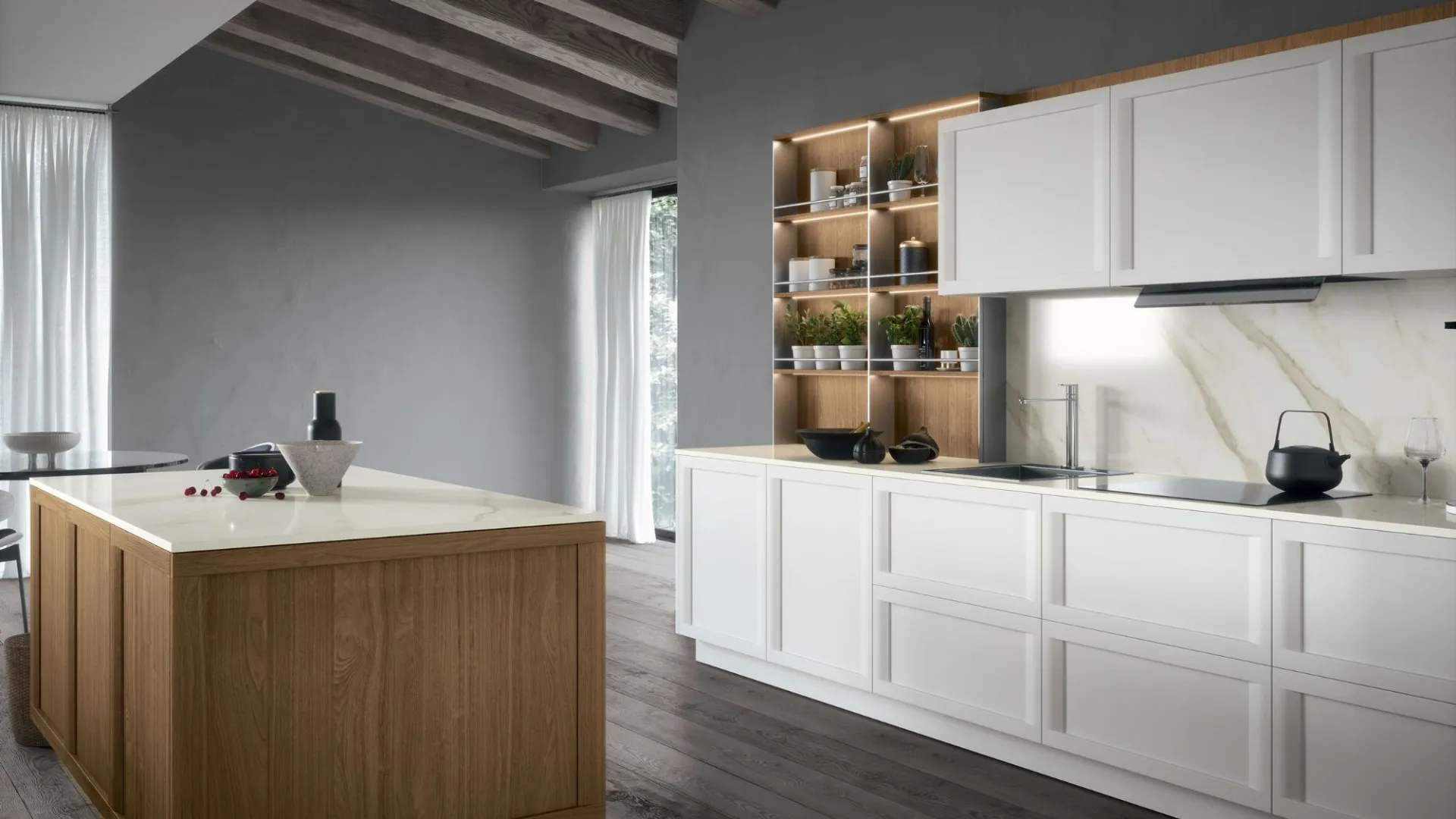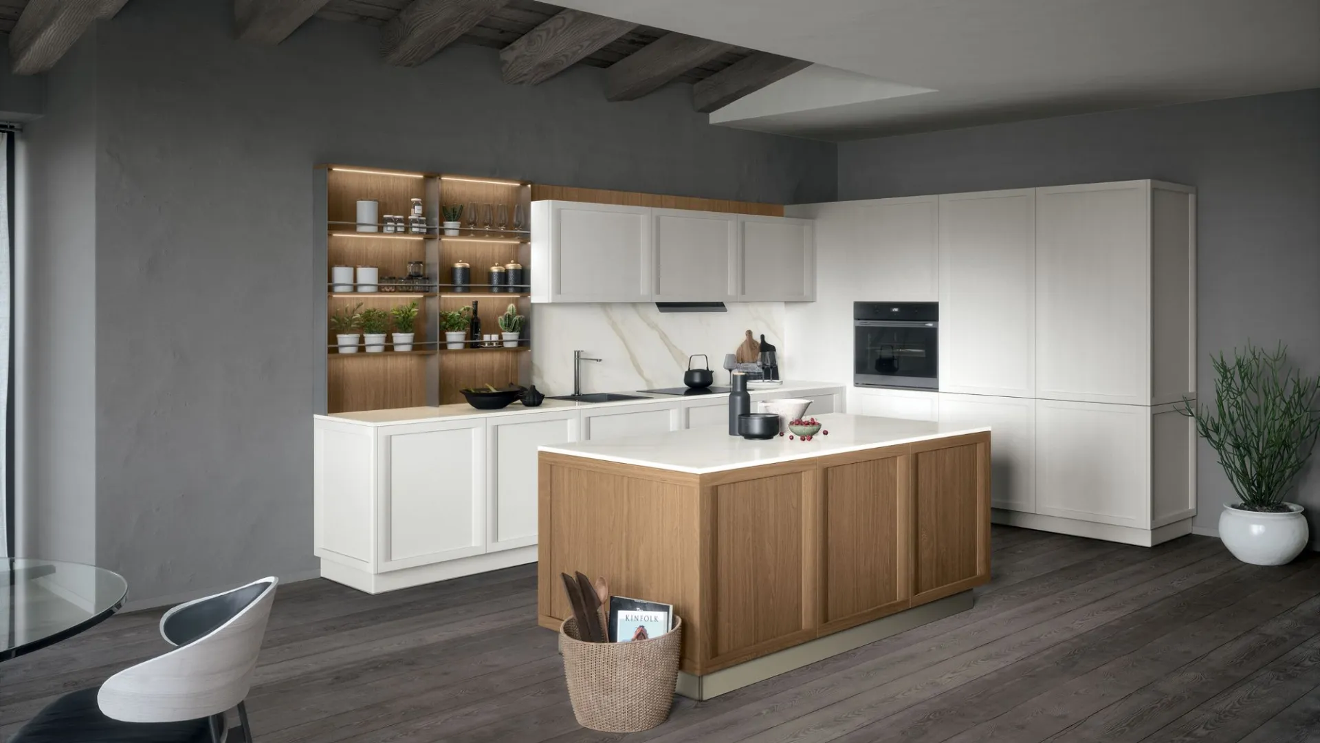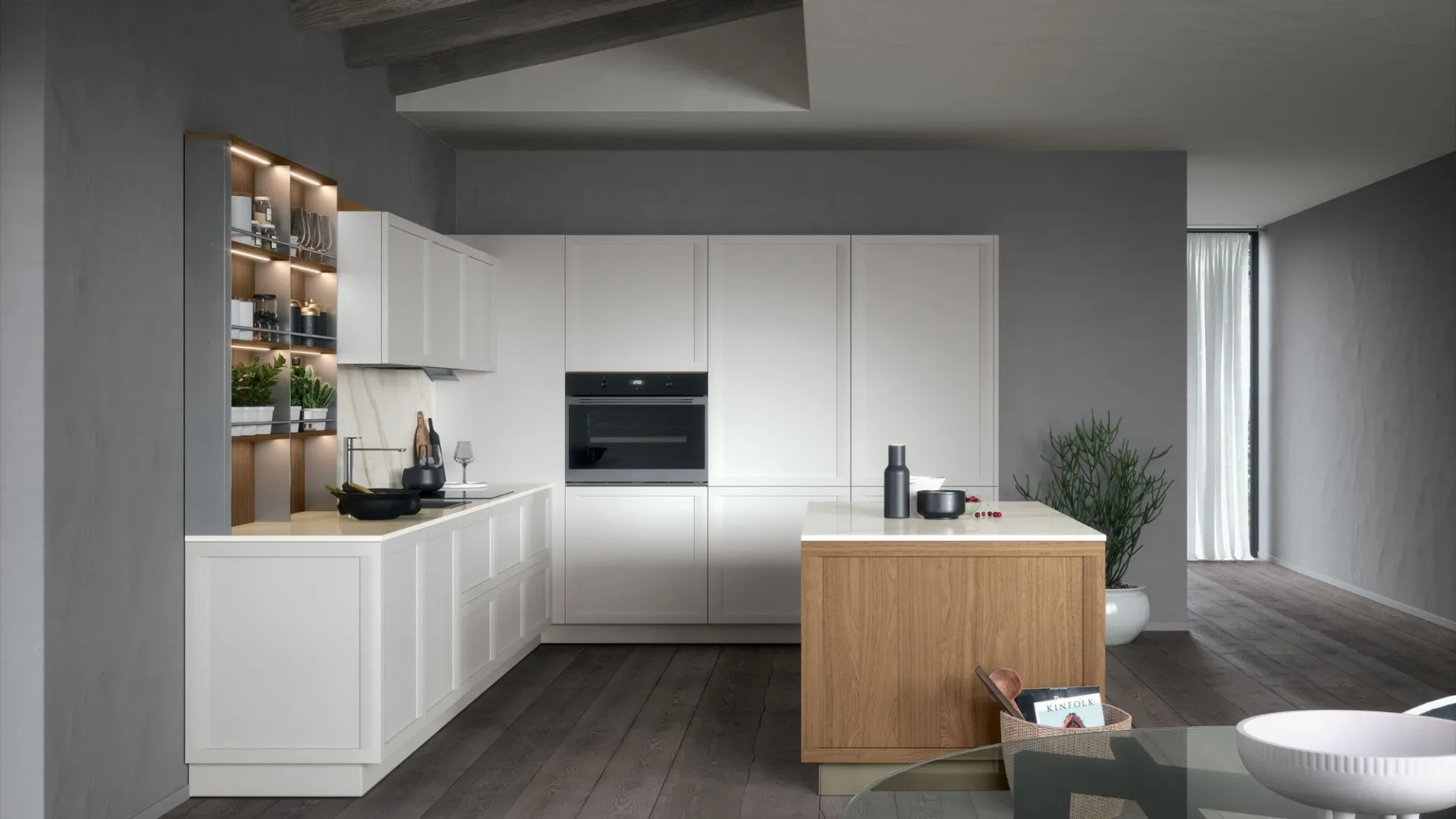La Bellaria 04 di Forma Cucine unisce eleganza raffinata e pragmatismo: l’anta a telaio con maniglia integrata dona un design sobrio e funzionale.
