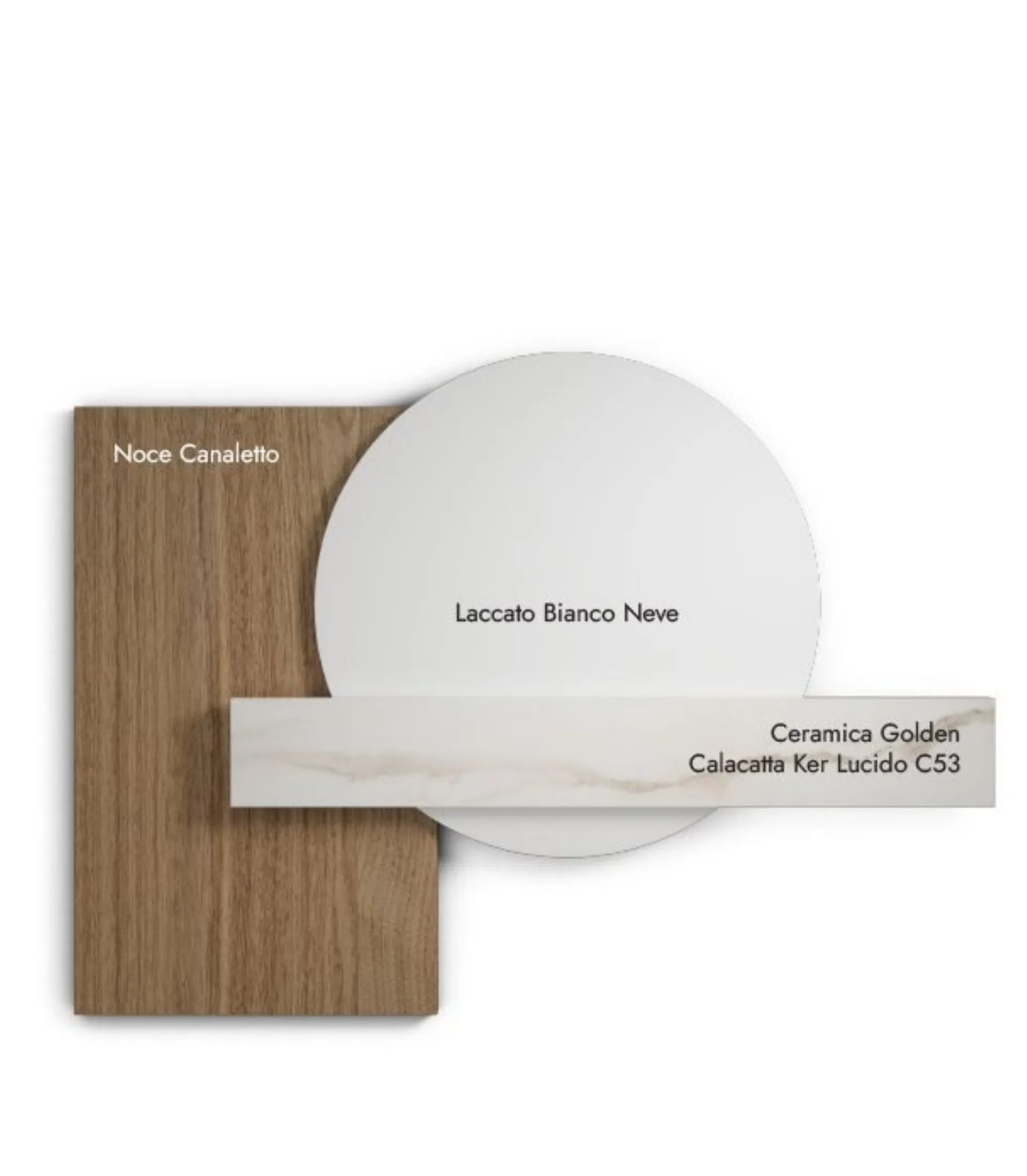 Il top e lo schienale sono in ceramica Golden Calacatta lucida, combinando estetica e resistenza.
