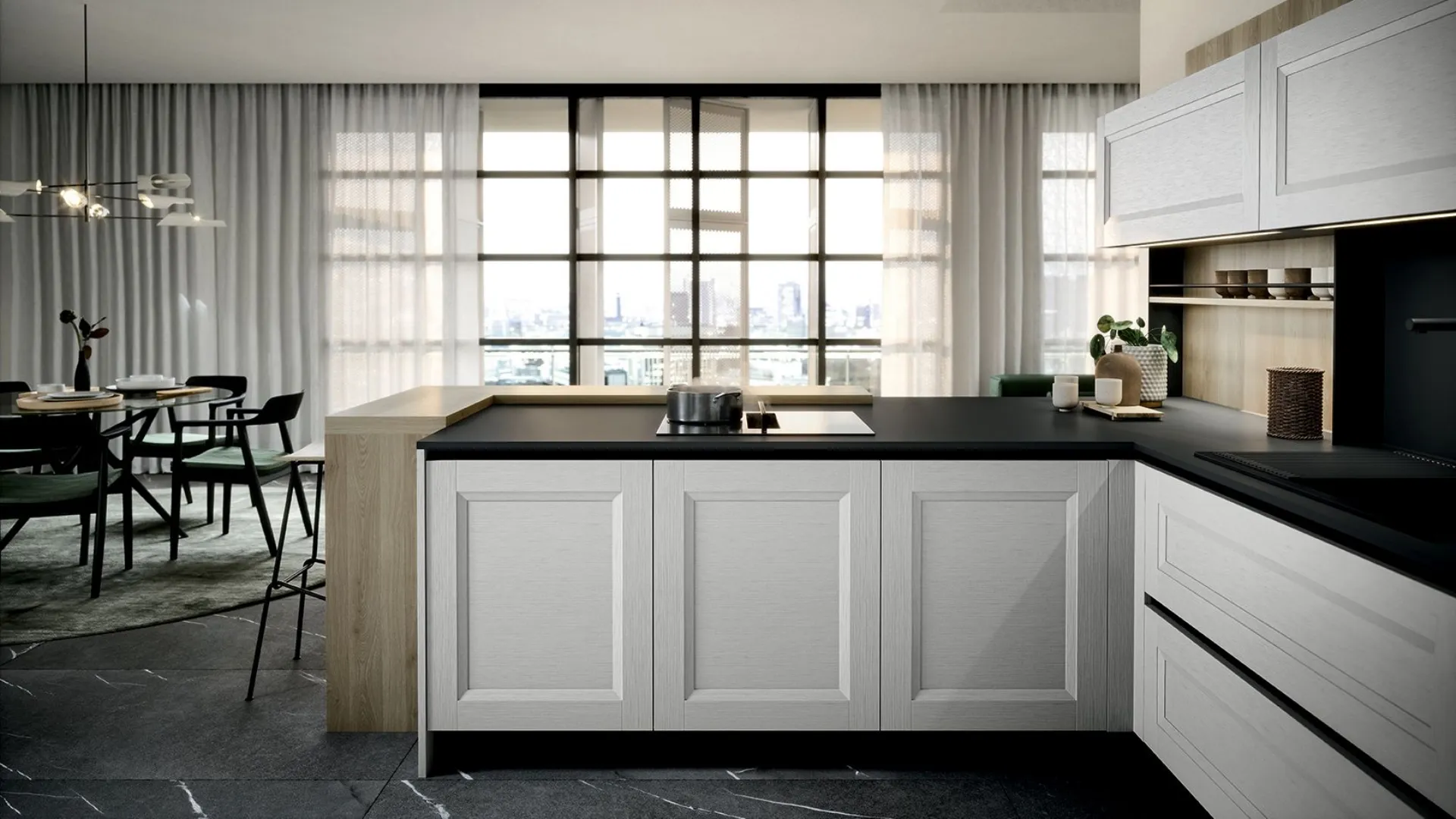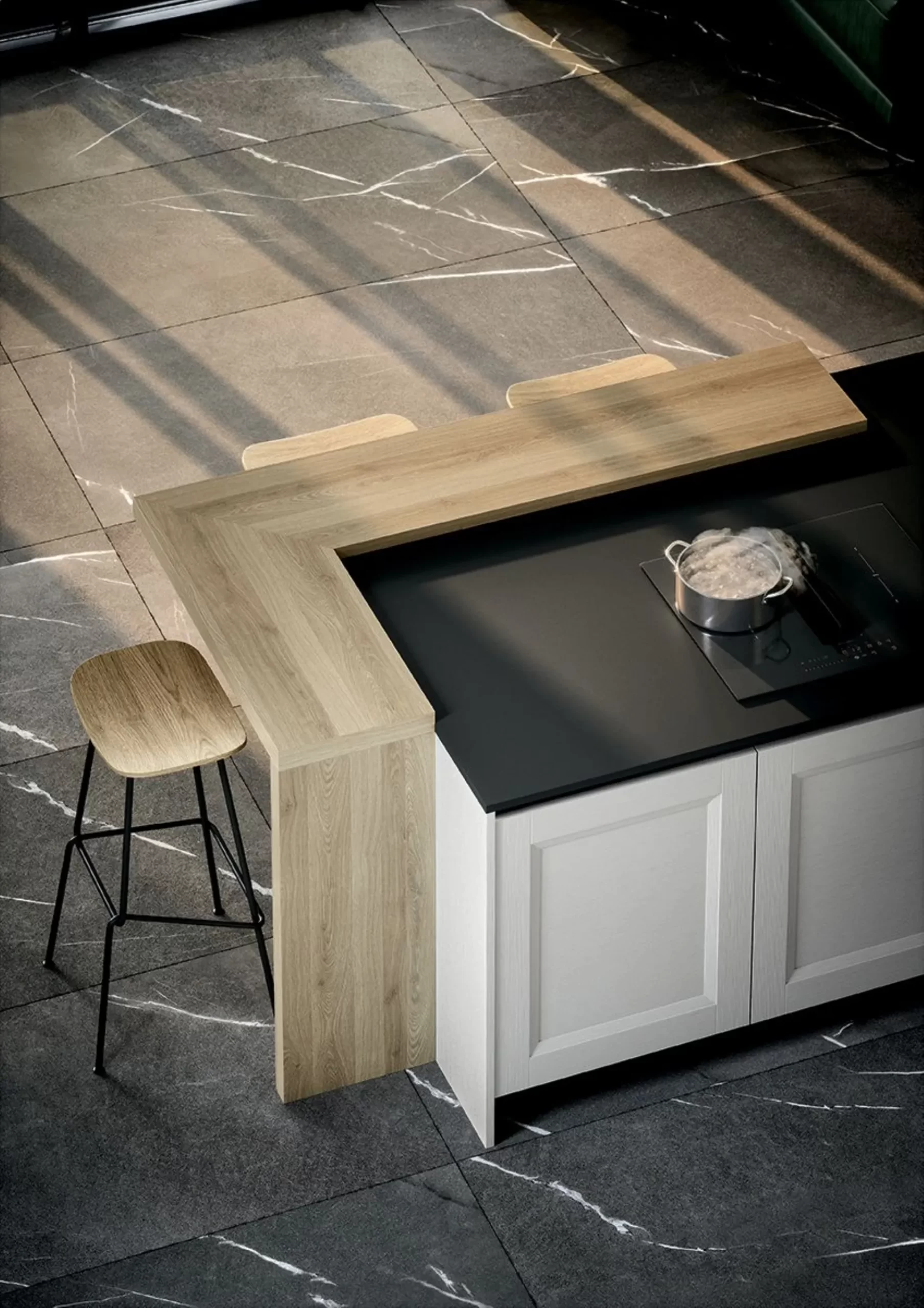 Il piano di lavoro in Fenix nero Ingo conferisce un tocco moderno, abbinato agli schienali in Rovere biondo per un equilibrio materico caldo.
