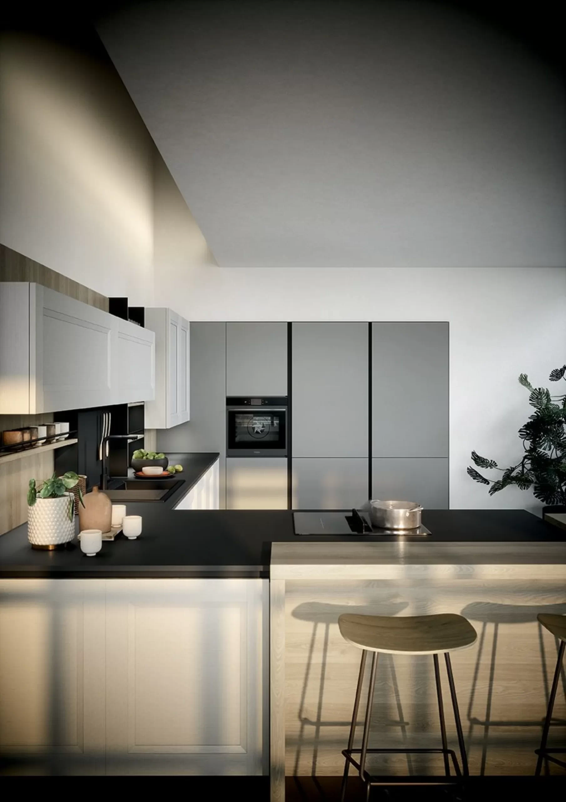 La Cucina Asia 01 di Forma Cucine unisce geometrie rigorose a colori neutri per un risultato contemporaneo e accogliente. Le ante sono laccate grigio chiaro, mentre le colonne mostrano un grigio medio opaco, creando un contrasto raffinato.