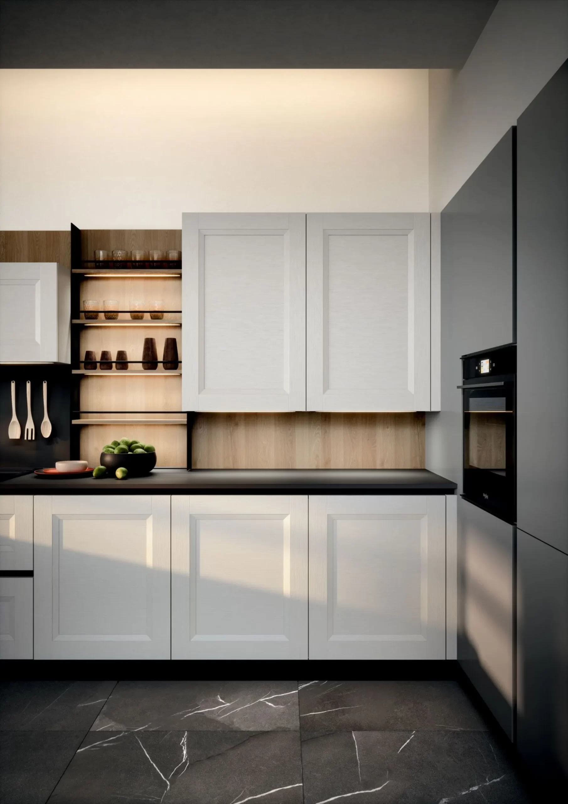 Il bancone snack “Frame” si integra perfettamente con la colonna a angolo con forno e con elementi verticali, offrendo soluzioni funzionali e flessibili.