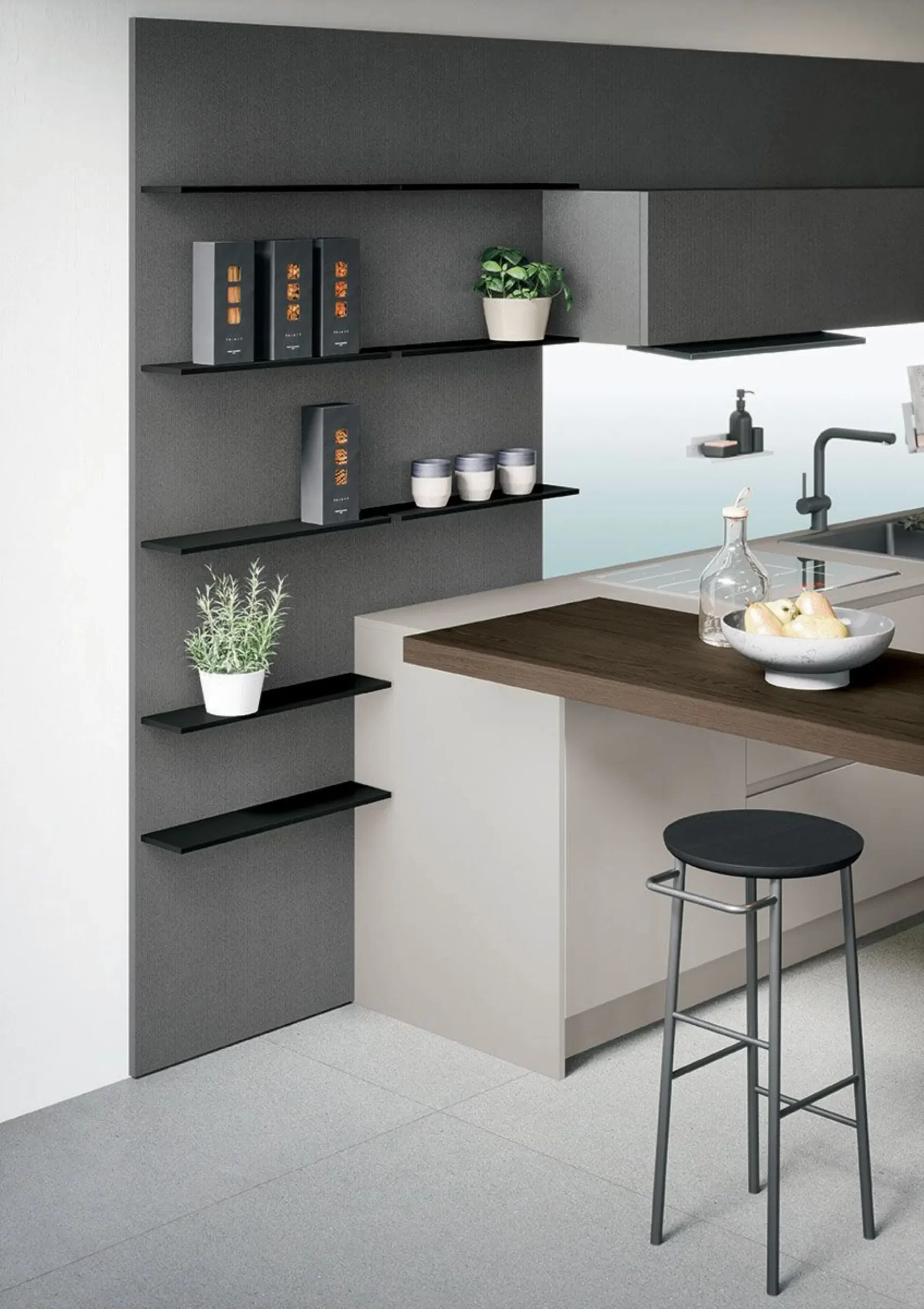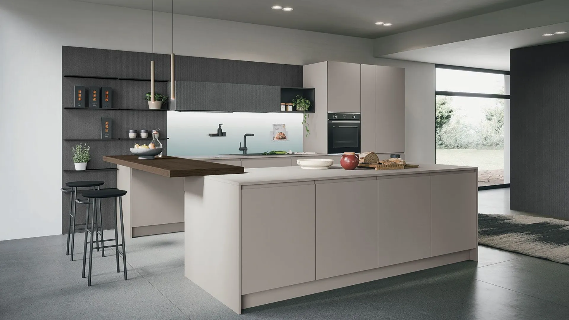 Cucina moderna Joy04 Forma pensata per la convivialità mescola funzionalità e armonia visiva con materiali ricercati e atmosfere accoglienti.