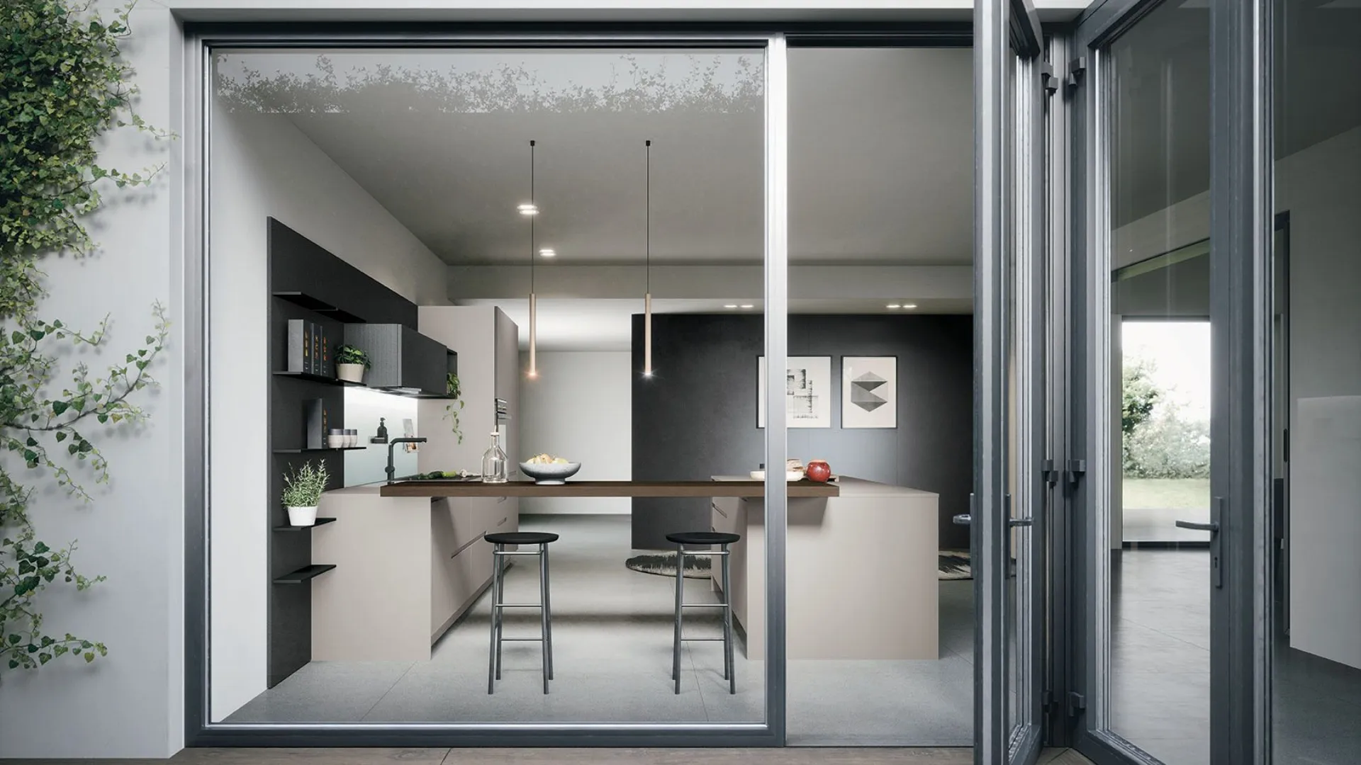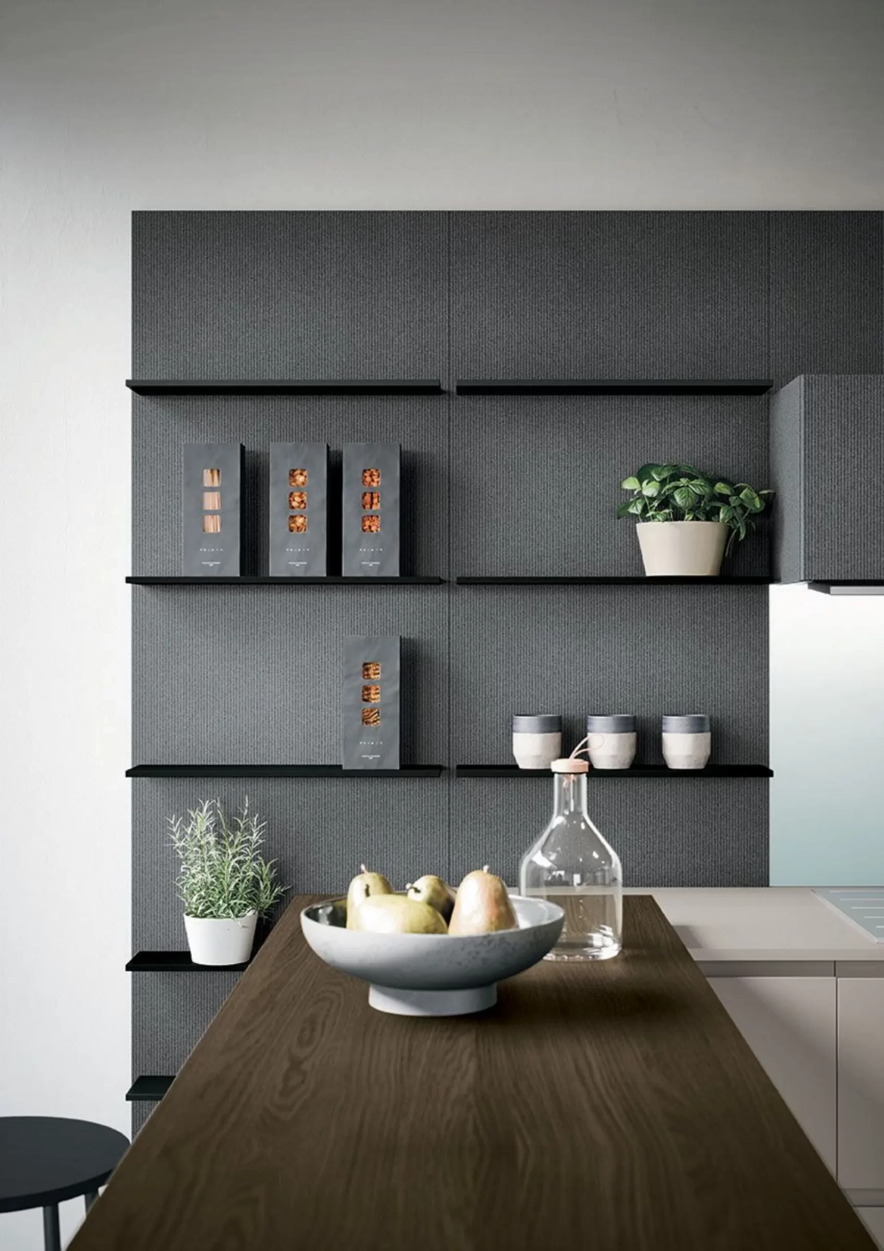 La combinazione dei materiali crea contrasti eleganti conferendo carattere deciso alla cucina e costruendo un’atmosfera raffinata.