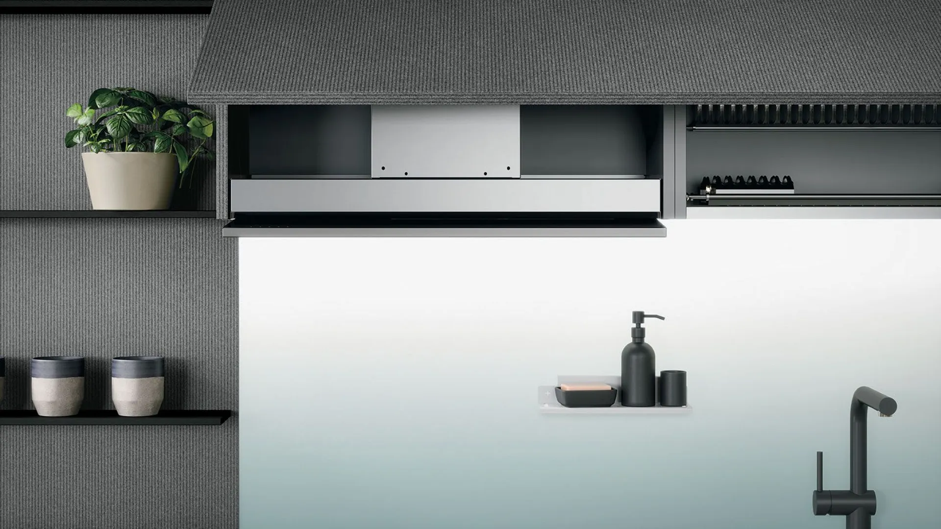 Il pensile Jumbo la cappa e lo scolapiatti offrono ampi spazi contenitivi mantenendo la composizione ordinata efficiente utile e costante.