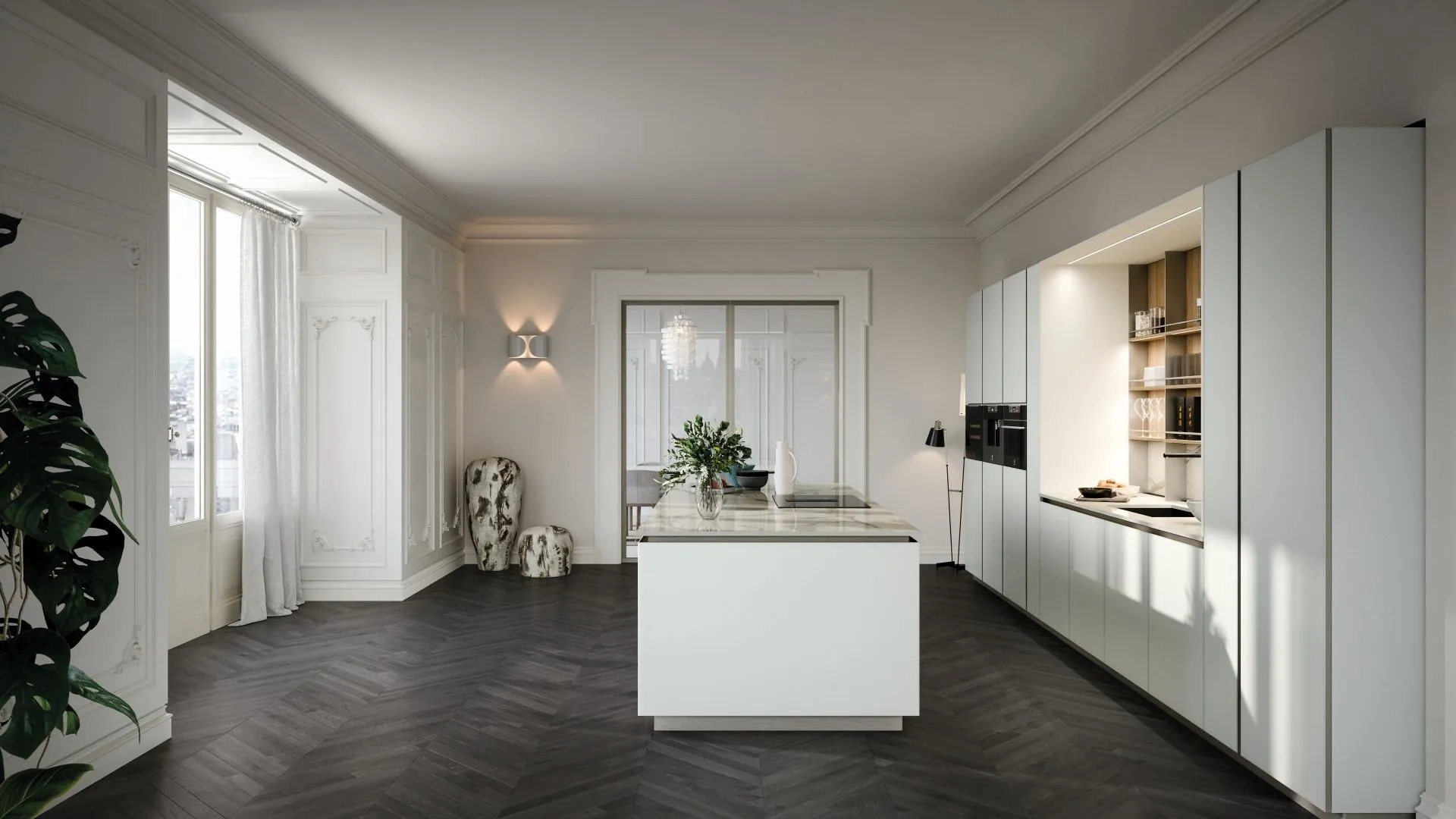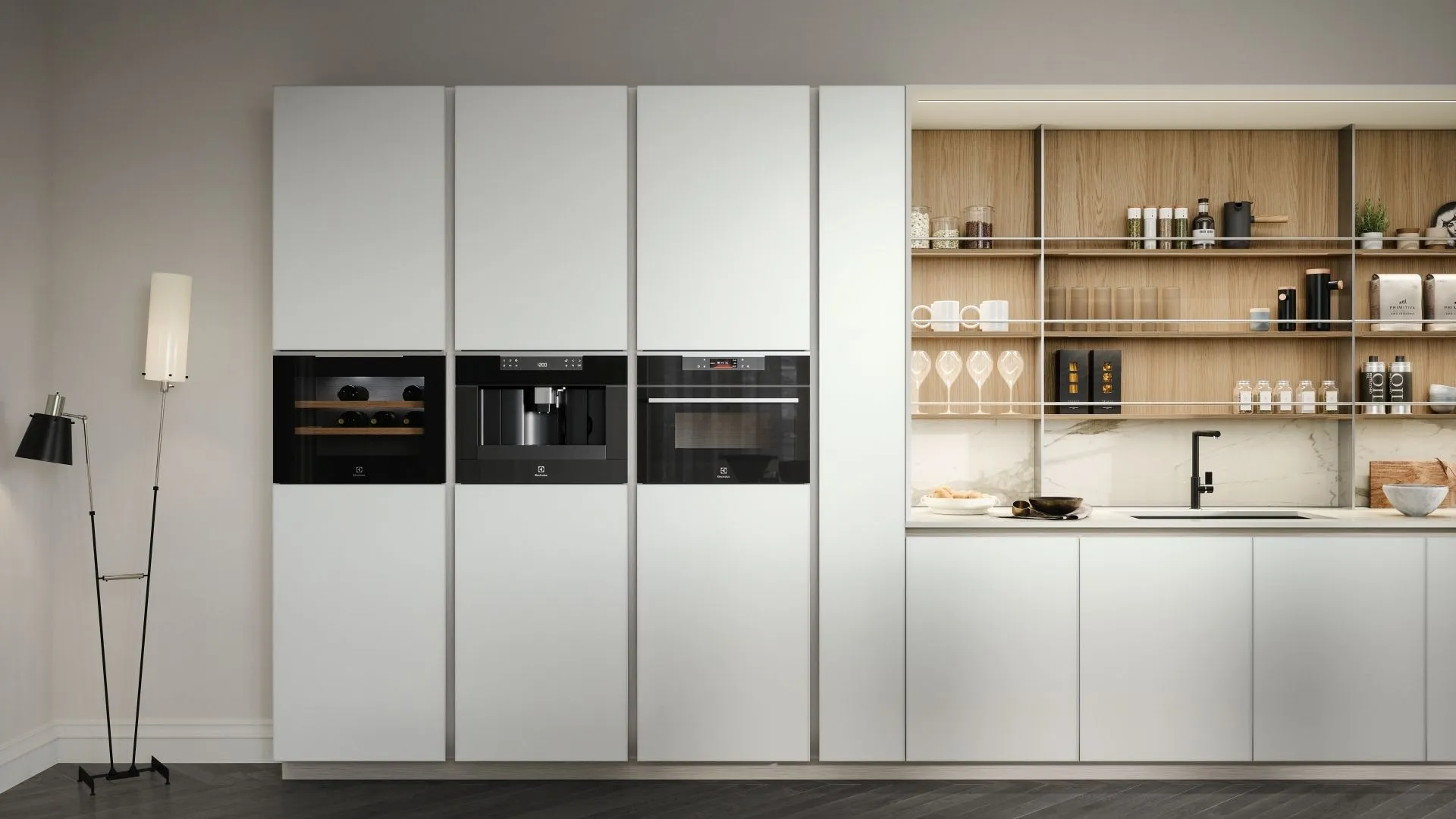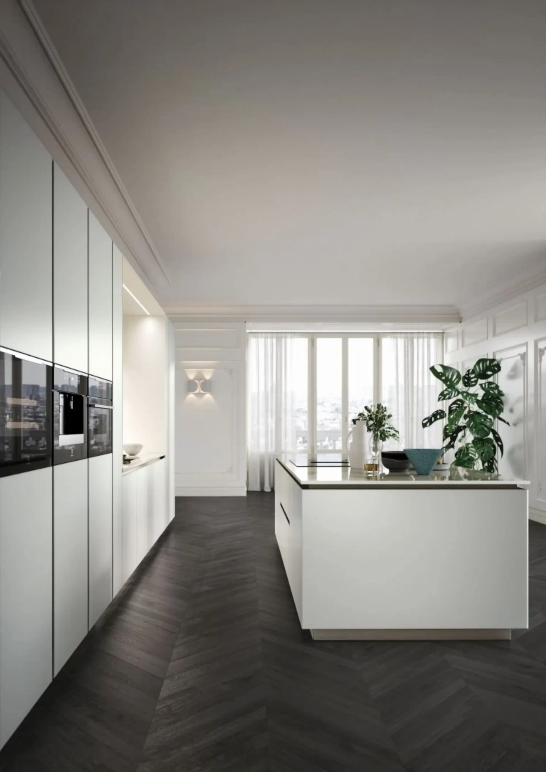 La Cucina Aria Tech 05 di Forma Cucine è una composizione elegante che unisce estetica sofisticata e grande praticità: l’isola centrale amplia il piano di lavoro, mentre i fianchi terminali permettono alla gola di percorrere tutto il perimetro con continuità, valorizzando lo spazio con leggerezza. Le ante in vetro Blu Oceano dal telaio nero si integrano perfettamente con le colonne in Rovere Brianza, creando un dialogo cromatico raffinato. Il top e l’alzata in ceramica Calacatta lucida (C53) donano luminosità e resistenza, mentre la struttura è completata da zoccolo e gola in metallo (finizione Metal) e da un bianco puro opaco che conferisce un tono delicato e moderno. Il risultato è un ambiente cucina accogliente e raffinato, pensato per chi desidera design, spazio e praticità in un’unica composizione.