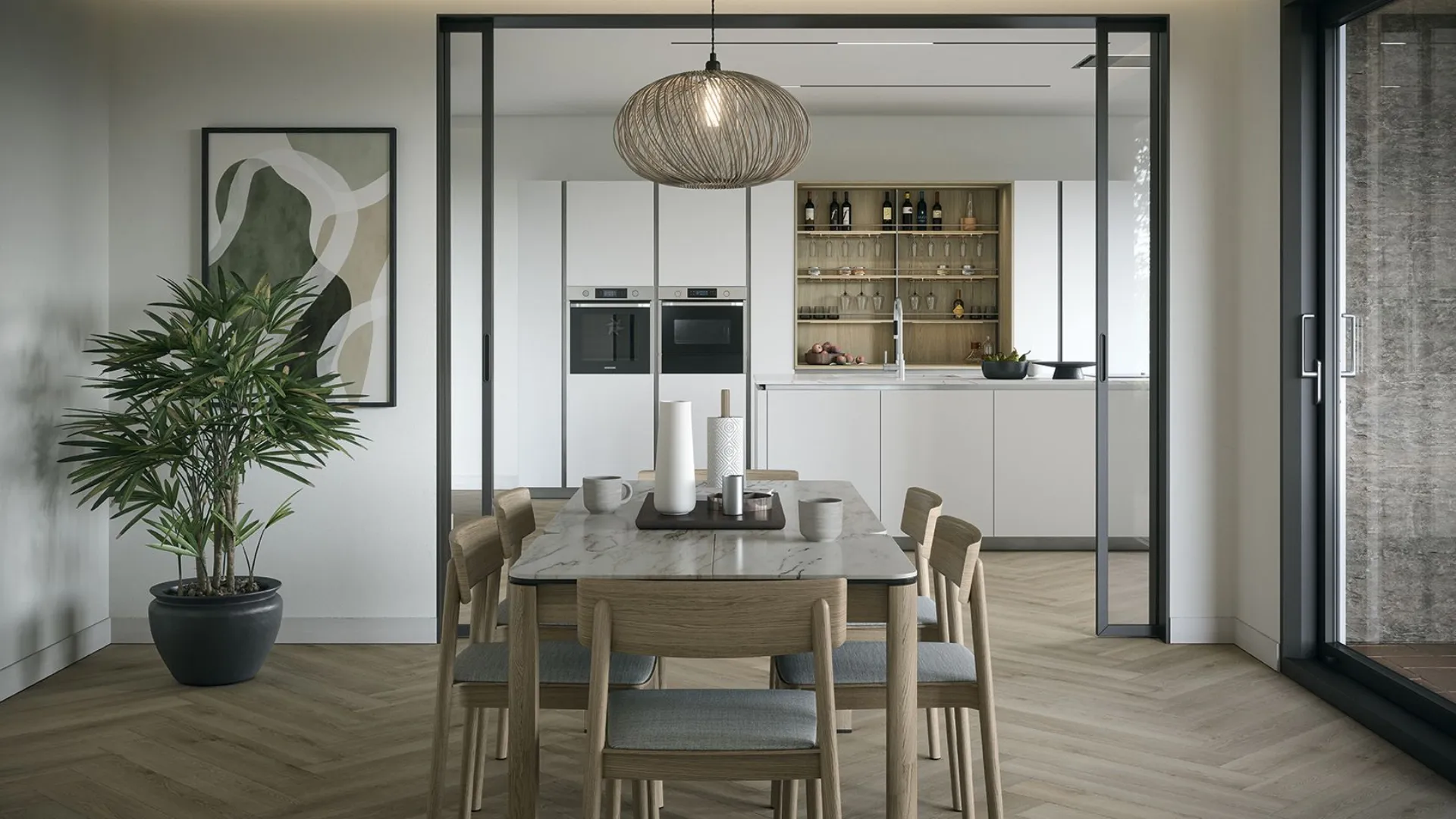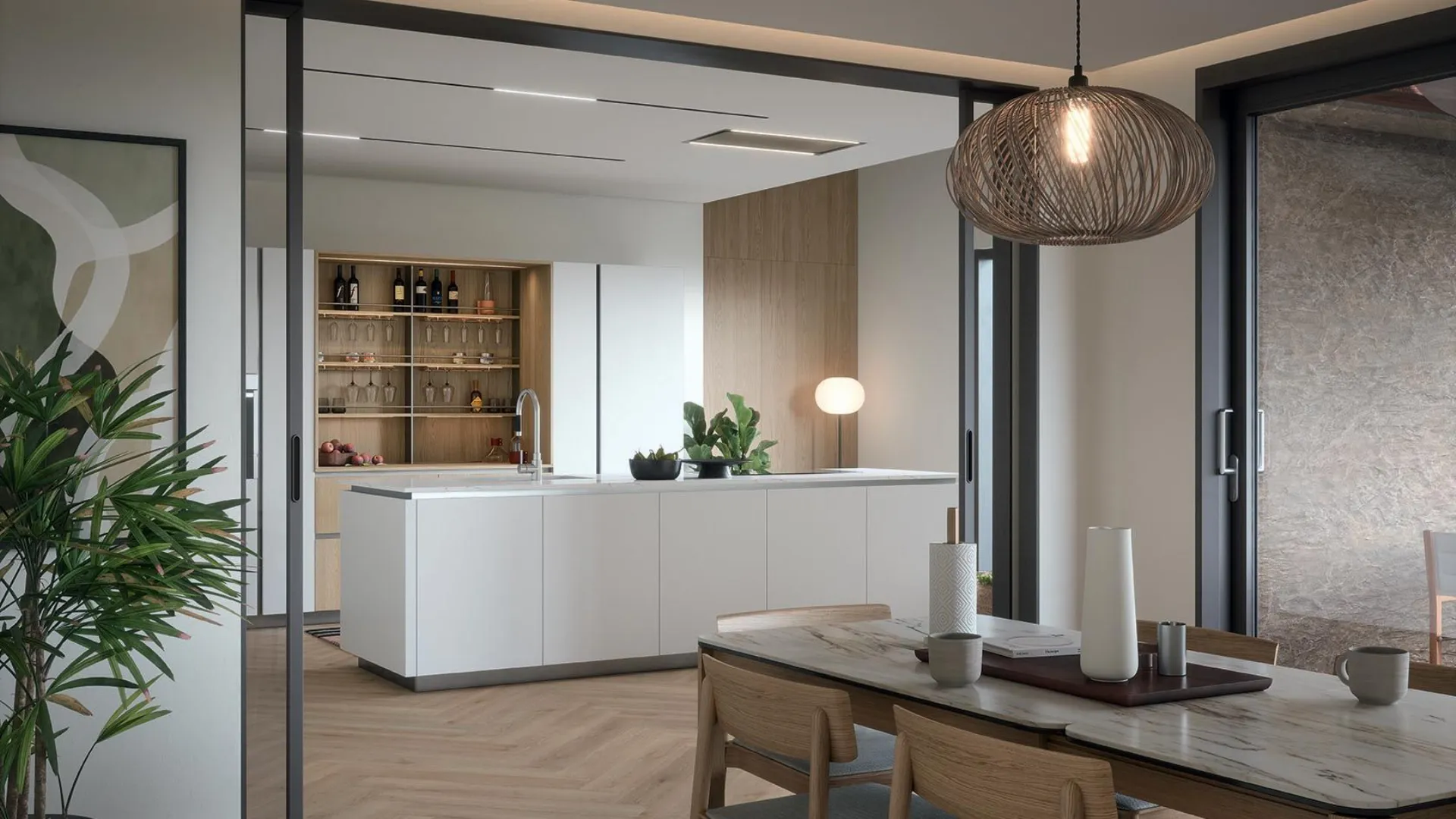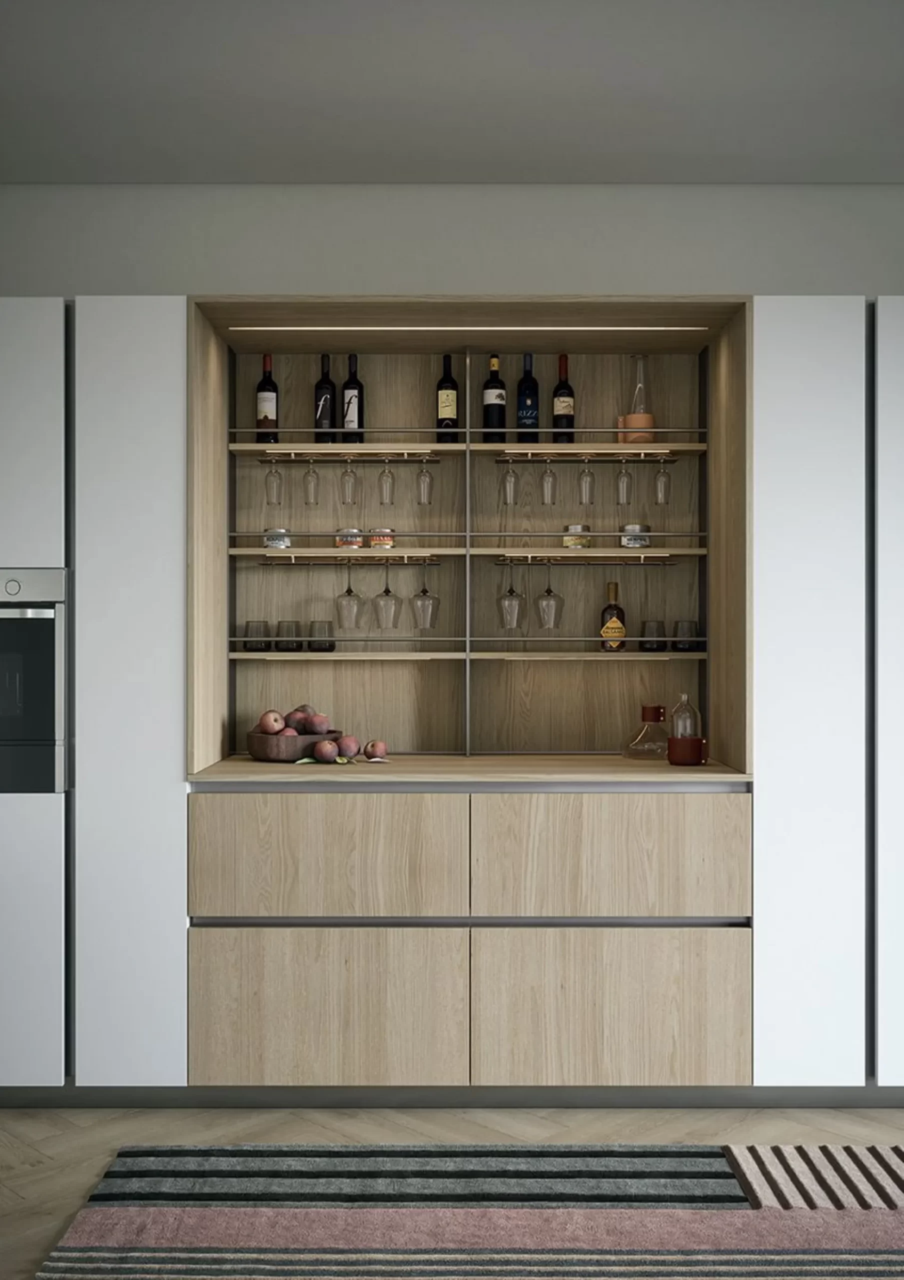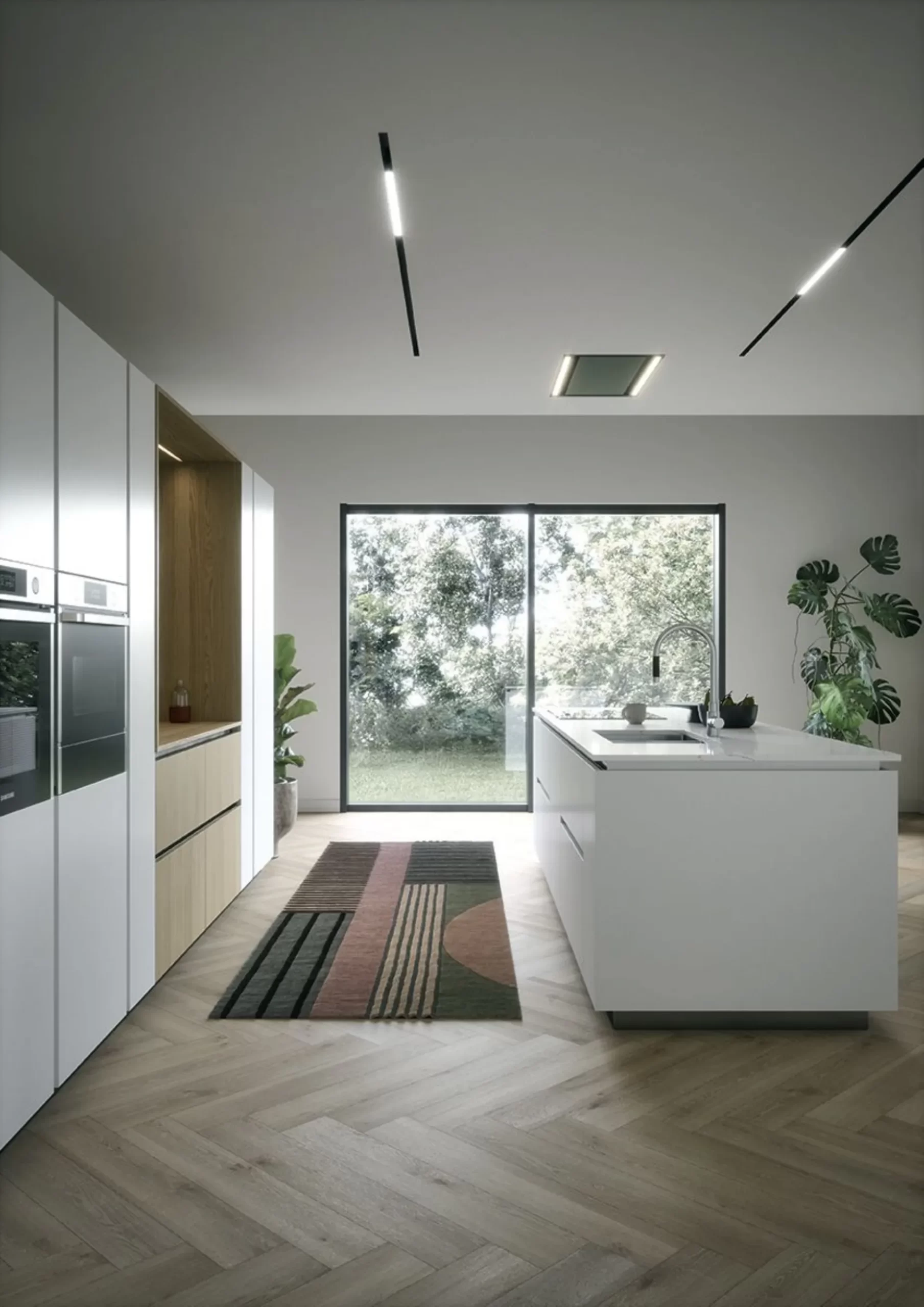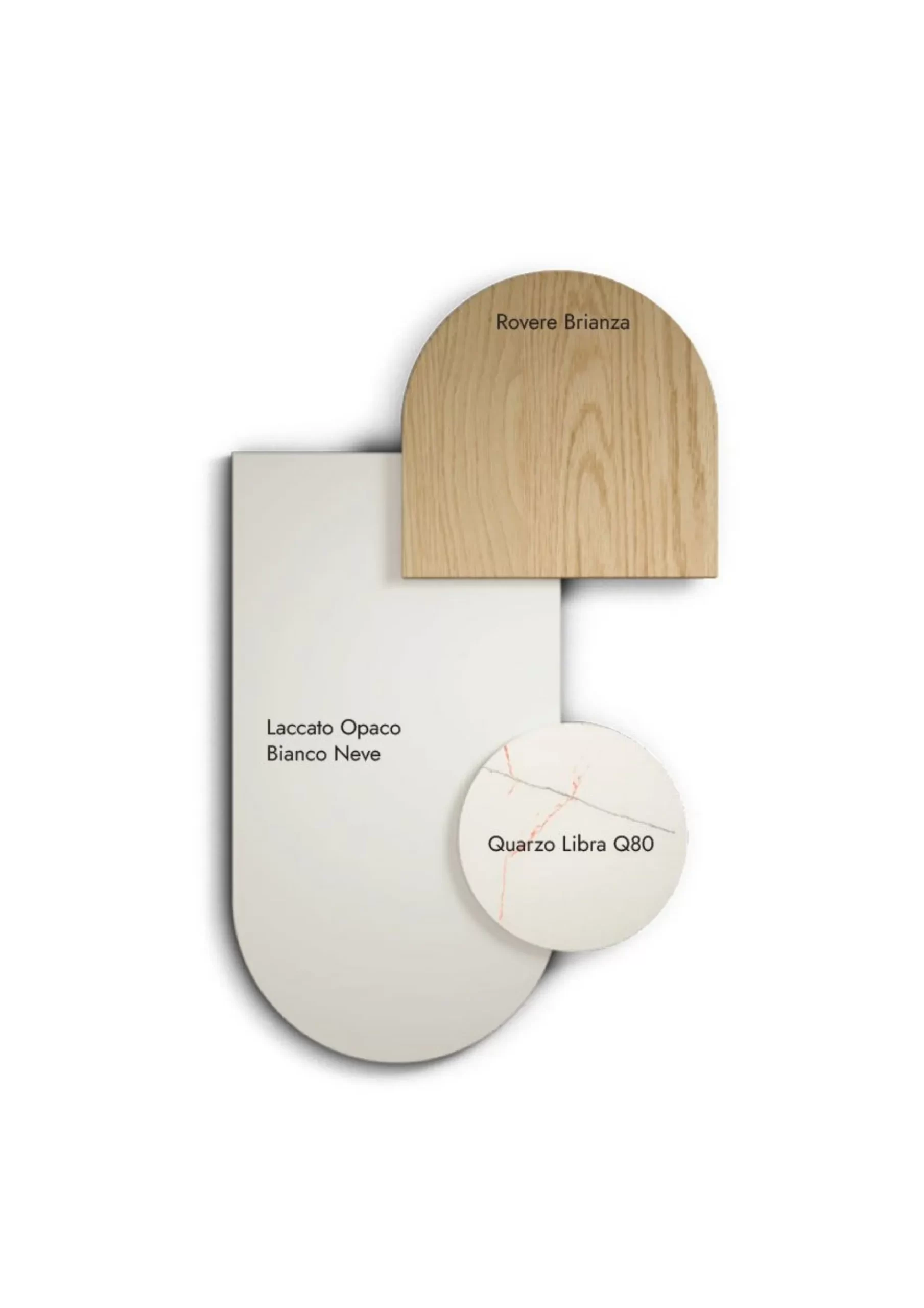 La Cucina Trend 04 di Forma Cucine risplende in un’atmosfera calda e luminosa: la finitura laccato lucido Bianco Neve domina l’ambiente, mentre il blocco centrale in Rovere Brianza aggiunge un tocco materico e accogliente. Le linee sono pulite, essenziali e raffinate, valorizzate da ampi cassettoni che garantiscono grande capacità contenitiva. Gli accessori Vertical offrono spazio ben organizzato con ripiani e sistemi modulari. Il top in quarzo Libra Q80 garantisce resistenza chimica e una superficie elegante, mentre gli zoccoli e le gole in finitura Metal conferiscono un tocco moderno e deciso. Questa cucina è perfetta per chi ama uno stile sofisticato ma senza fronzoli, puntando su luminosità, funzionalità e raffinatezza.