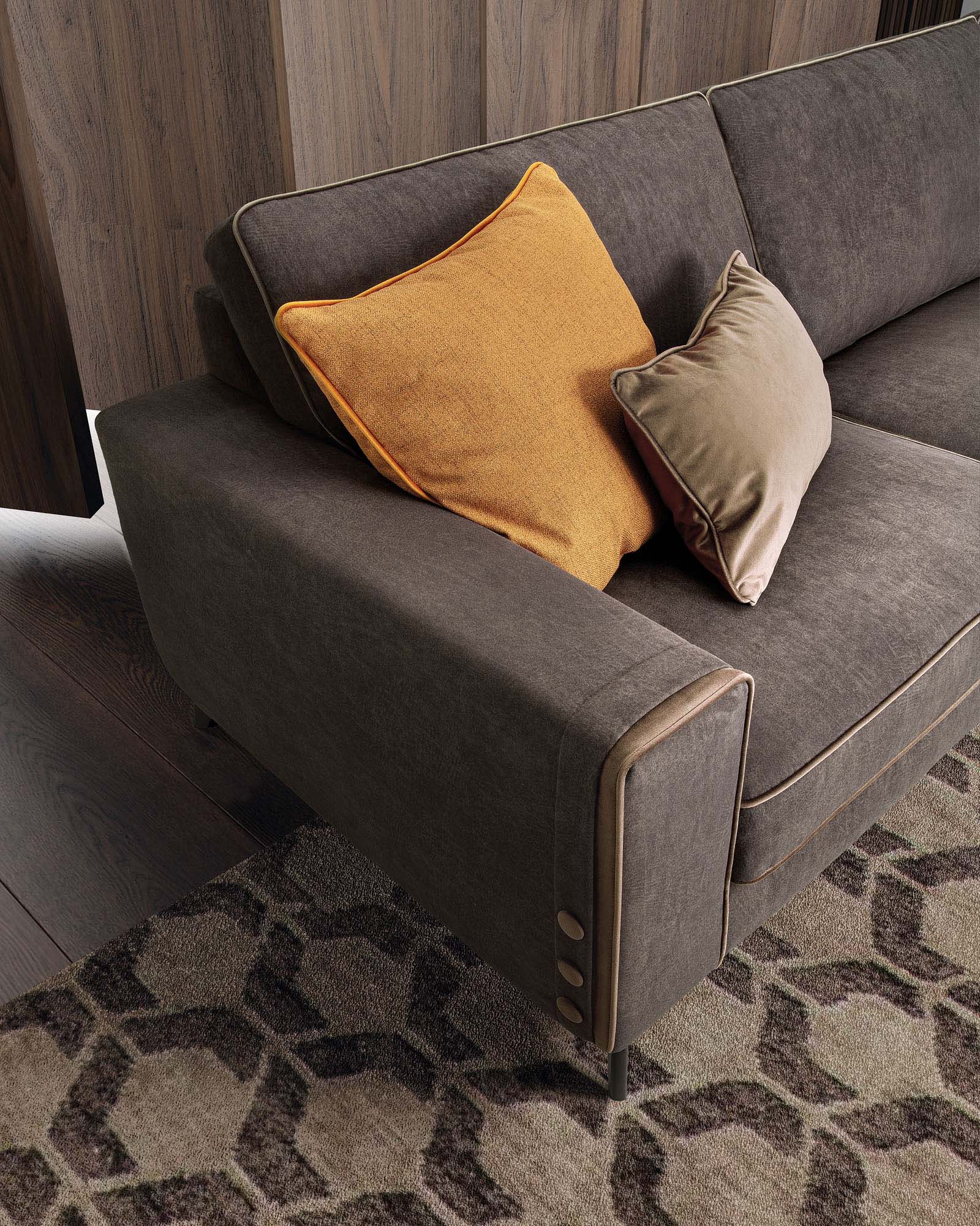 Sul bracciolo laterale, tre bottoni in similpelle delineano una “tasca finta” in tessuto, creando un contrasto visivo sofisticato con la base più uniforme e sobria.