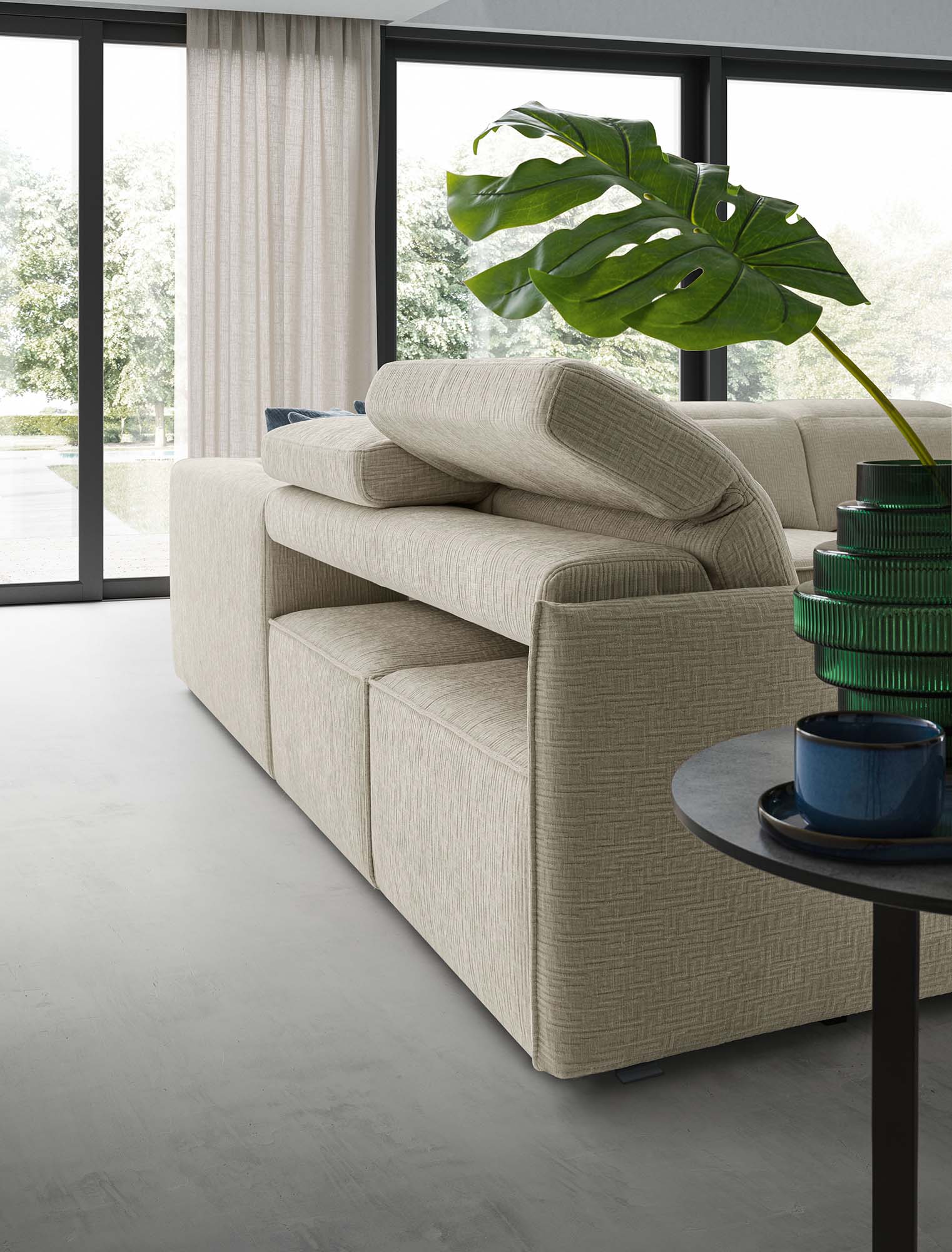 Le sedute sono estraibili, consentendo di regolare la profondità e creare un’area relax più generosa quando serve.