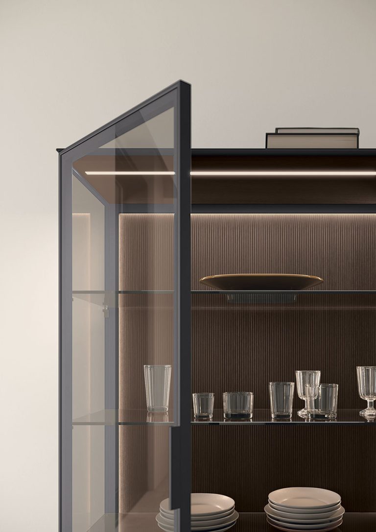 Il vero elemento distintivo è la schiena illuminata. Studiata per esaltare il materiale utilizzato e creare un suggestivo gioco di luci e profondità. L’illuminazione integrata dona calore all’ambiente e rende la vetrina protagonista della scena. creando atmosfere accoglienti e sofisticate, sia di giorno che di sera. Ogni dettaglio è pensato per offrire un equilibrio perfetto tra estetica e funzionalità, tra trasparenze e superfici piene, tra luce e materia.
