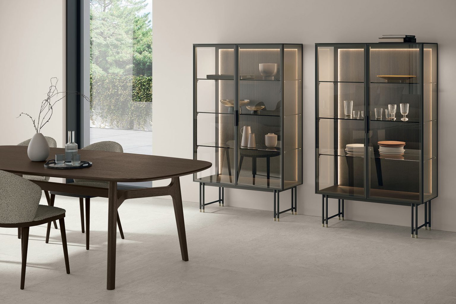 La vetrina Joyce è un elemento d’arredo dal forte impatto scenografico. Questa vetrina è capace di coniugare leggerezza visiva, raffinatezza formale e funzionalità quotidiana. La sua struttura slanciata e la trasparenza delle ante in vetro creano un effetto di grande eleganza. Permette di esporre gli oggetti con discrezione, senza mai appesantire lo spazio. Joyce arreda con stile, valorizzando ciò che custodisce e trasformando ogni contenuto in parte integrante del progetto estetico.