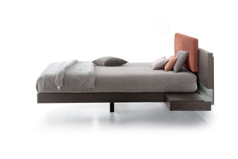 Il design include comodini laterali integrati con struttura in metallo, per un effetto di continuità e leggerezza. Disponibile nelle versioni sospesa, a terra o con contenitore, Shiro offre ampia personalizzazione: finiture materiche effetto legno, cemento, calce o laccato opaco; rivestimenti cuscini in tessuto o pelle Nabuk; piedini dal profilo basso o sospeso.