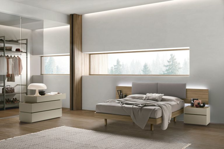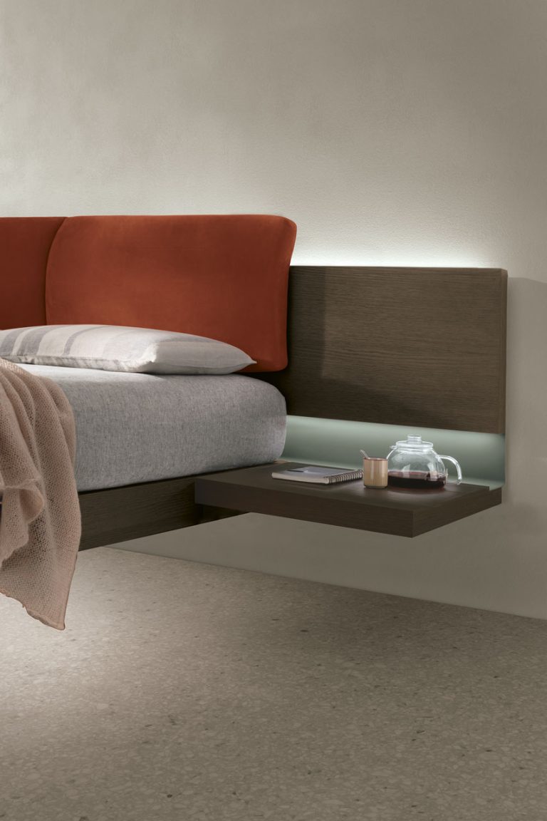 Il Letto Shiro di Tomasella è una vera e propria esperienza d’arredo: parte da un pannello materico che funge da testiera, addolcito da due grandi cuscini applicati e impreziosito da un sistema di illuminazione a LED integrato.