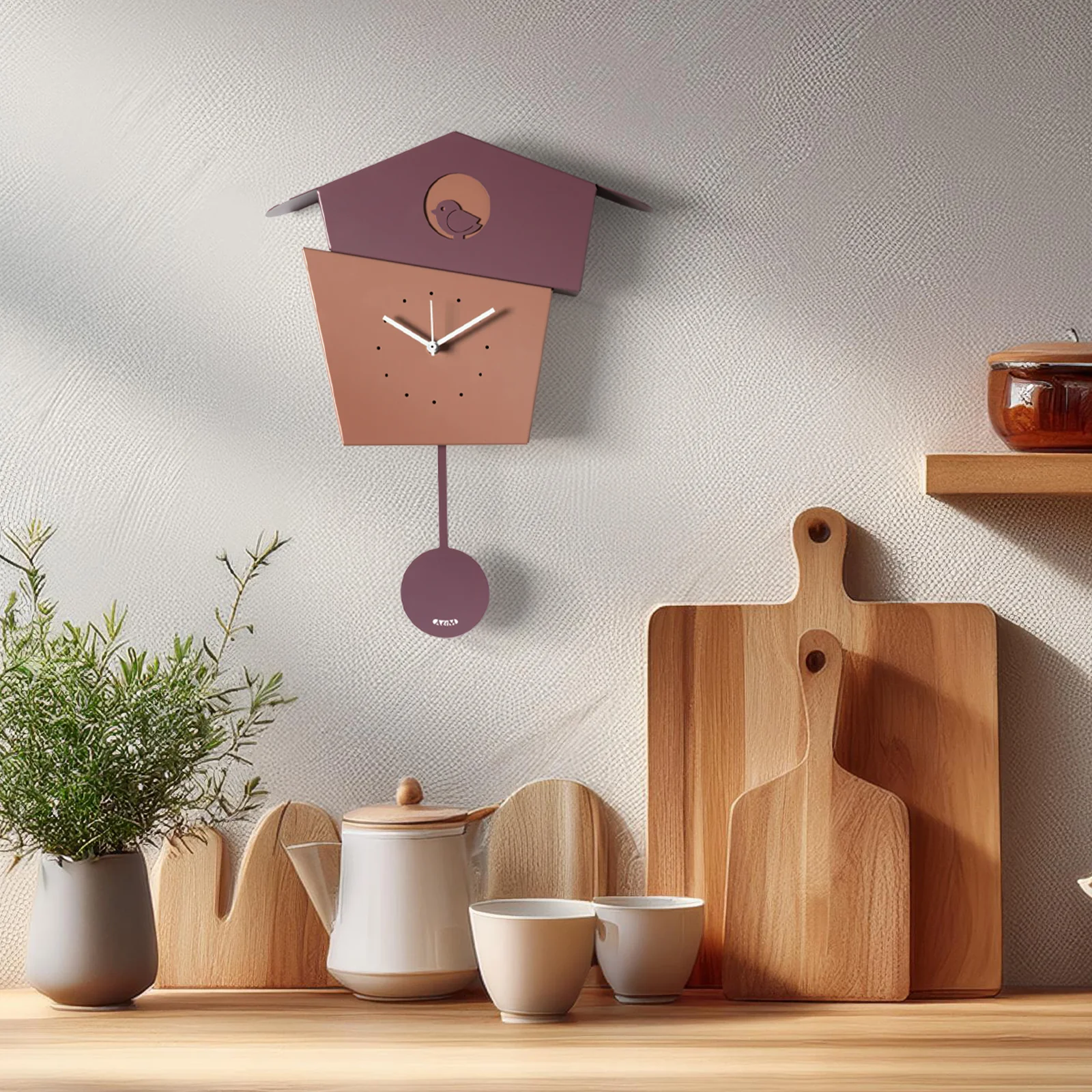 Un tocco delicato e sofisticato: l’orologio da parete Picchiarello nella variante viola ametista / mocha / viola ametista dona colore e poesia alle pareti. La struttura in ferro verniciato unisce tonalità pastello intense con dettagli raffinati, mentre l’elemento a pendolo visibile offre un movimento elegante e scenografico.