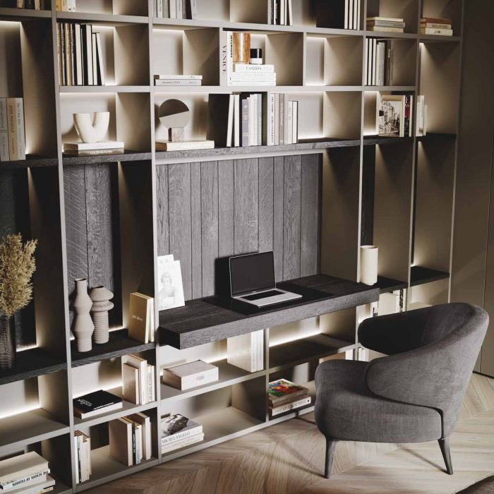 Le mensole sottili sono illuminate da LED, offrendo un’illuminazione soft che valorizza oggetti e libri.