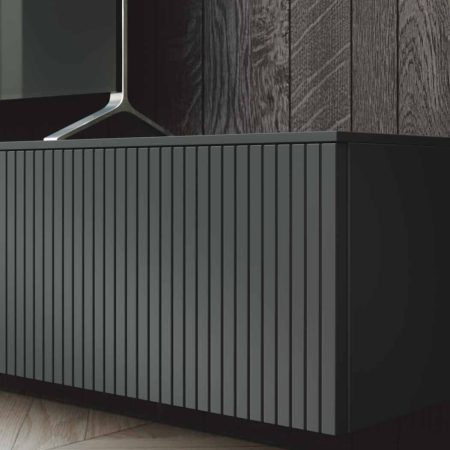 La struttura modulare permette di combinare elementi chiusi in laccato opaco e moduli a giorno in legno, integrati in una boiserie rigata che regala profondità e texture visive.