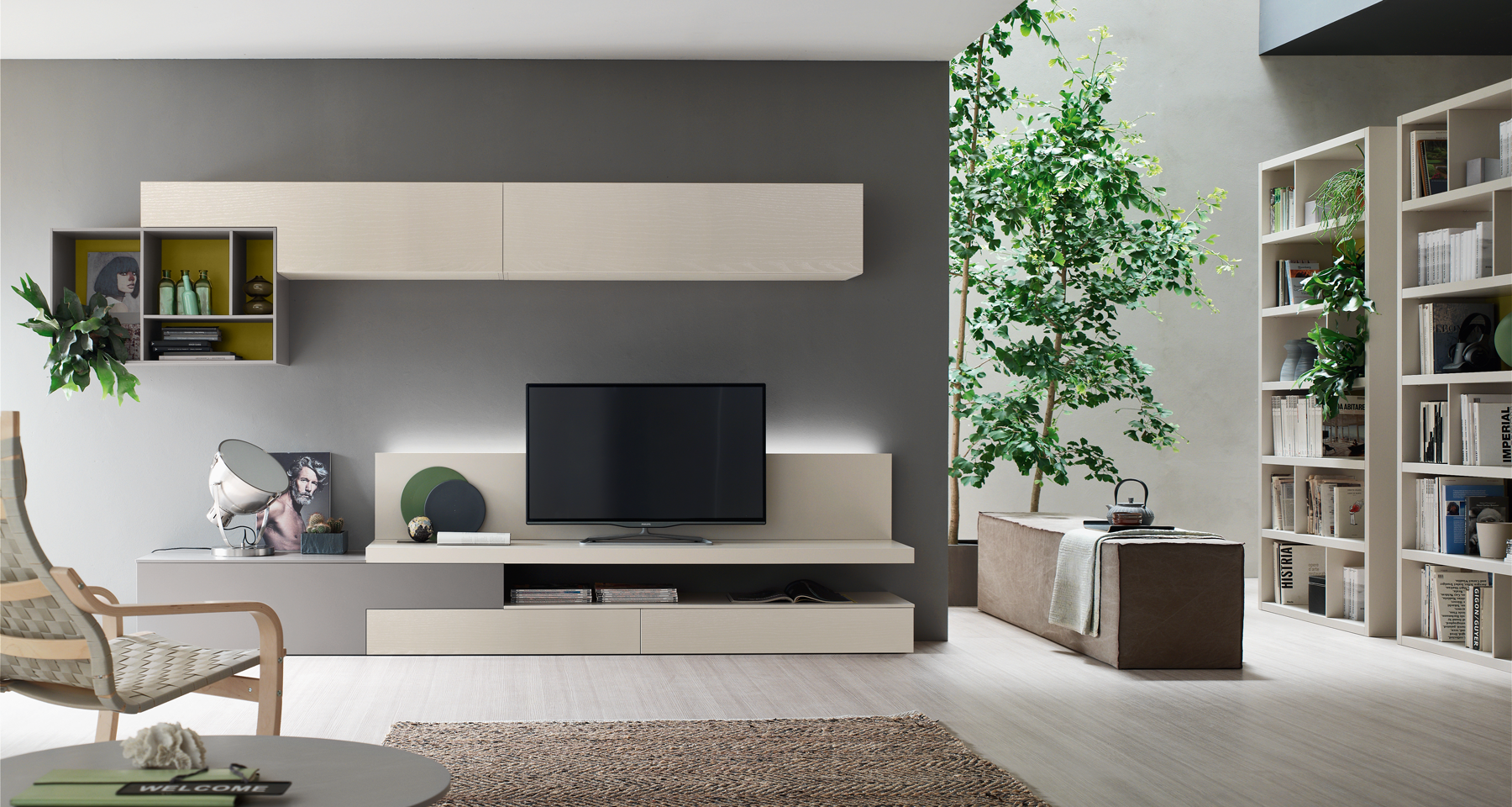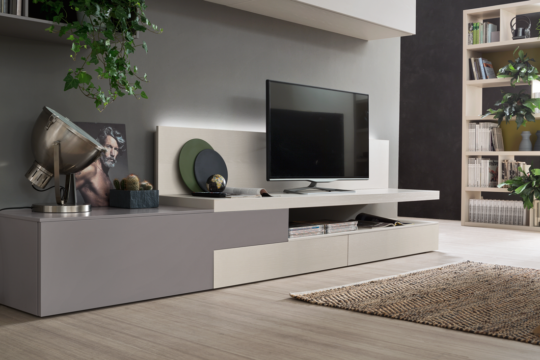 Grazie alla modularità del sistema Seta, SA2216 consente di combinare pensili, contenitori, vani a giorno e basi porta‑TV, adattandosi a spazi e stili diversi.