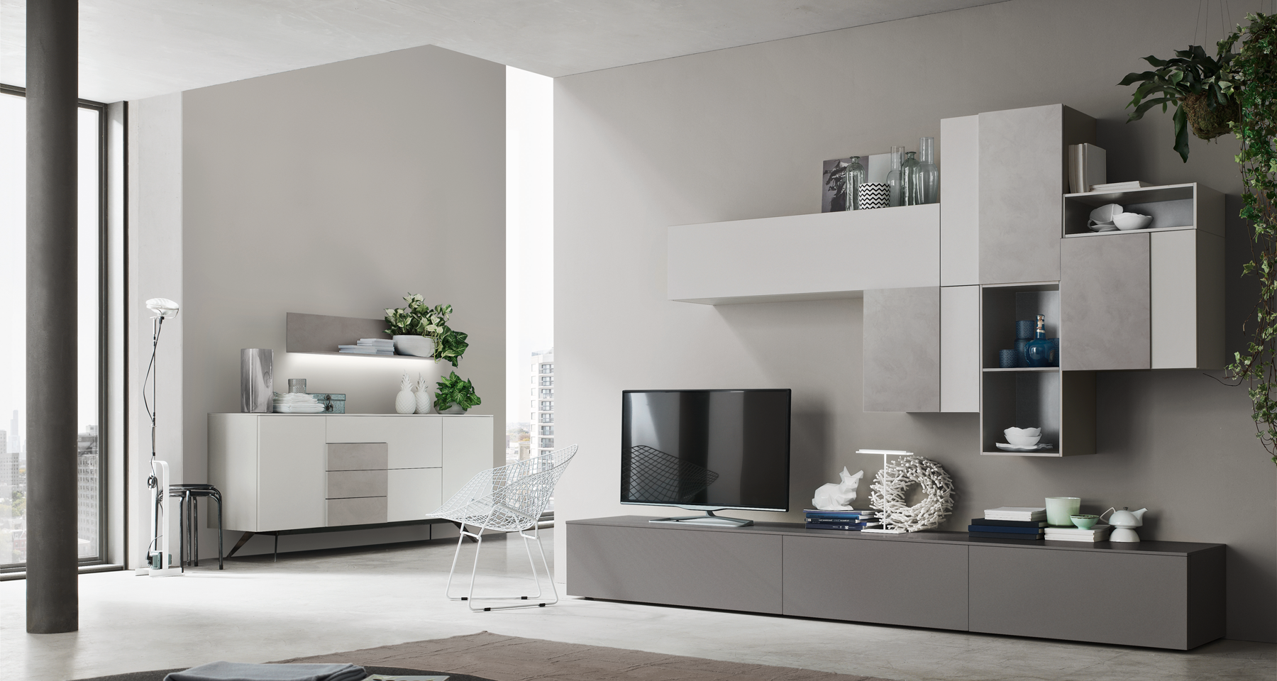 Il sistema permette di combinare contenitori chiusi, pensili, vani a giorno e basi porta‑TV per adattarsi a spazi differenti, valorizzando l’arredo con linee moderne e pulite.