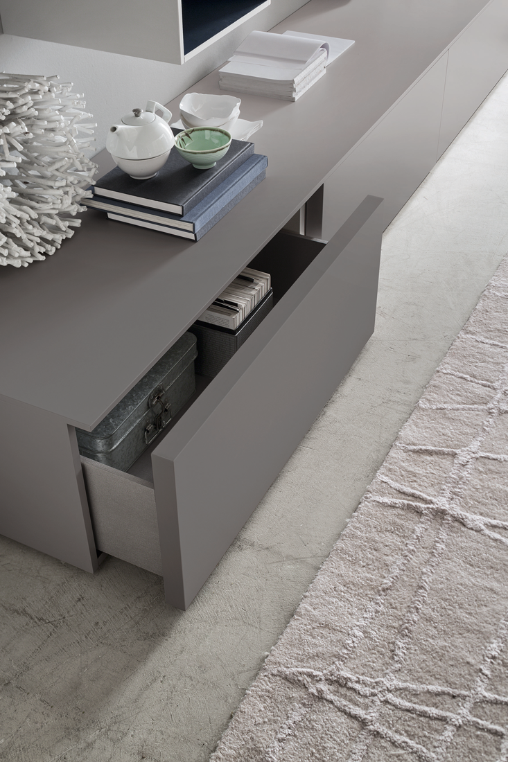 Le numerose finiture disponibili e la flessibilità nella composizione la rendono perfetta per soggiorni contemporanei, su misura e personalizzati.