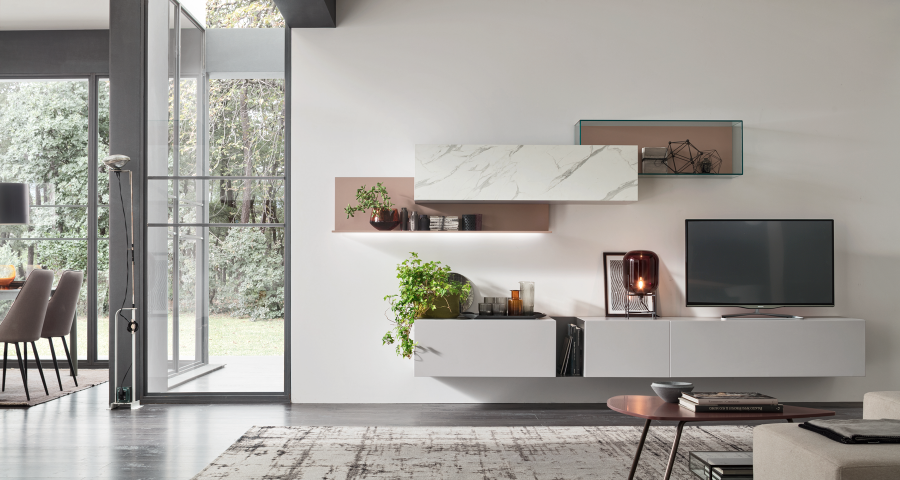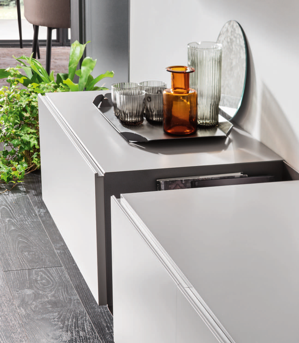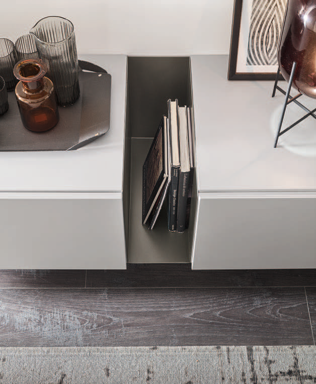 Linee pulite, modularità e ampia varietà di finiture consentono di personalizzare la composizione in base allo spazio e allo stile dell’ambiente.
