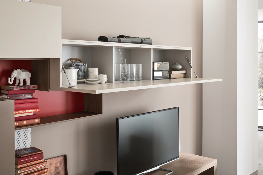 Grazie alla composizione componibile, permette di combinare moduli contenitori, pensili, basi porta‑TV e vani a giorno per creare soluzioni su misura.