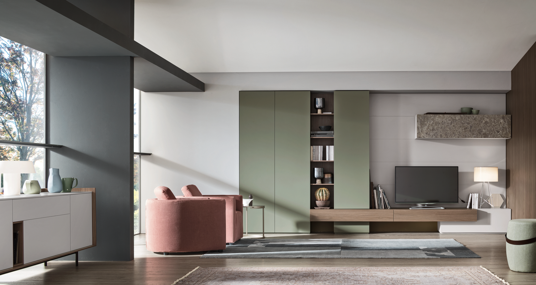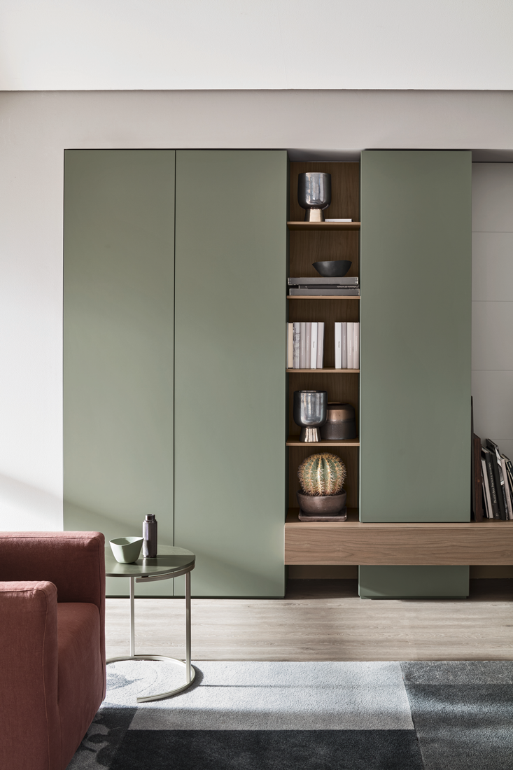 Ogni elemento si integra perfettamente in un gioco armonioso di volumi, creando un living ordinato, moderno e personalizzato.