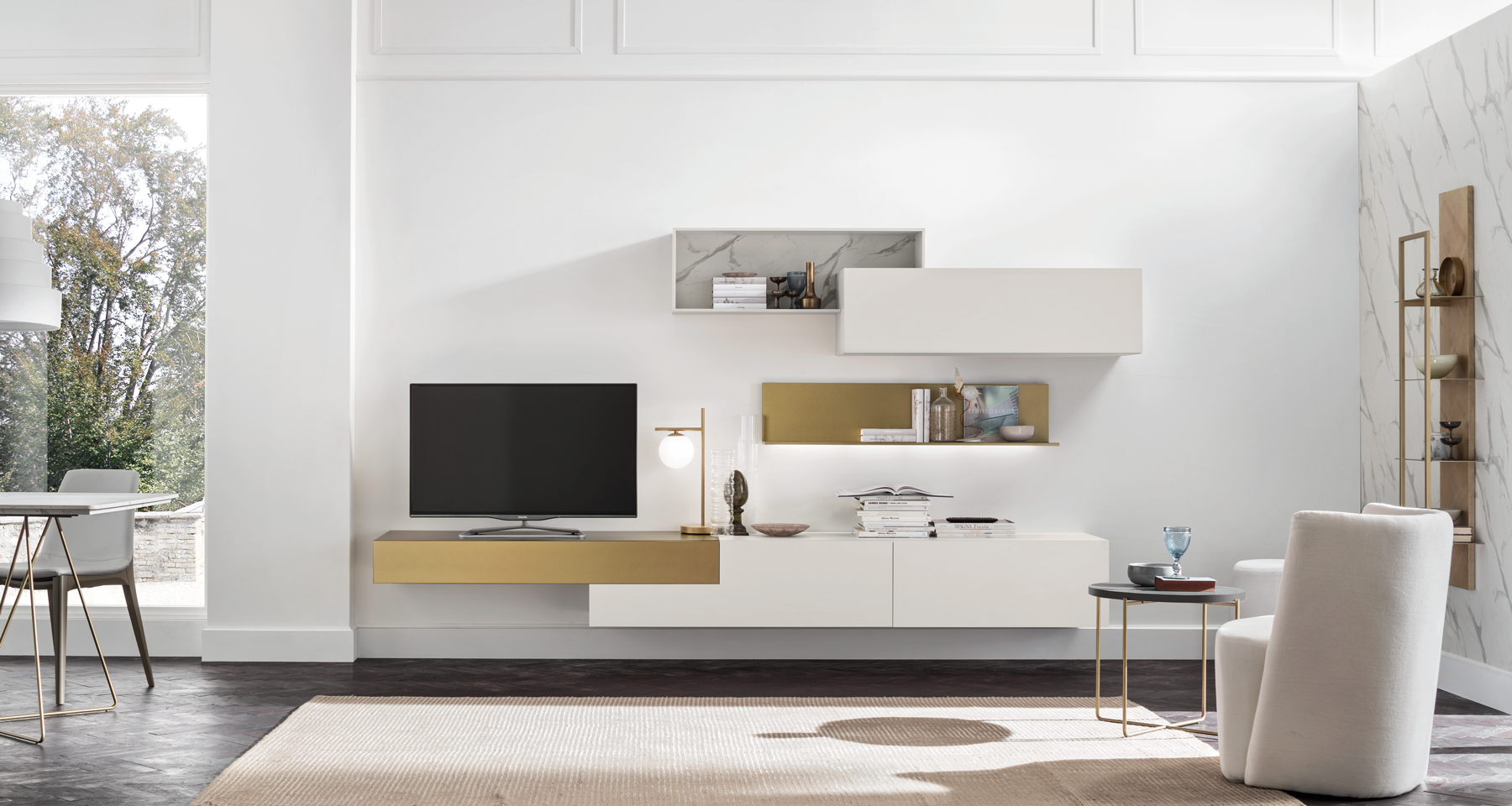 La parete attrezzata Seta/Unix SU2200 di Maronese ACF offre una composizione per living dal design moderno e altamente personalizzabile.