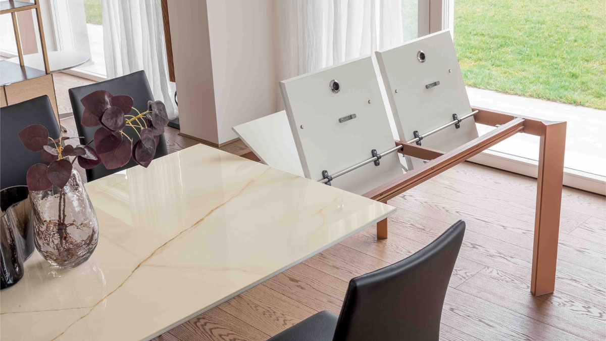 Tavolo da pranzo allungabile, struttura in metallo, meccanismo telescopico, piano in nobilitato, vetro, legno, effetto malta o ceramica, prolunga interna a libro.