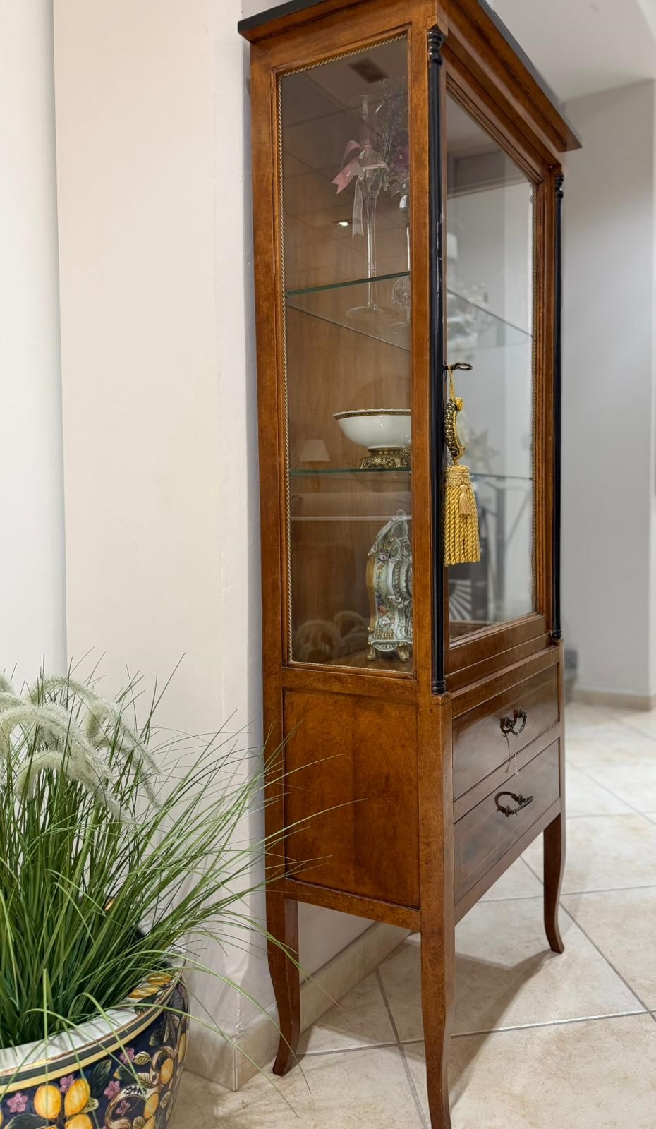 Allo stesso tempo, la scelta di materiali pregiati garantisce qualità, resistenza e durata nel tempo. Le essenze lignee selezionate con cura, unite a vetri raffinati e finiture eseguite con precisione artigianale, testimoniano una produzione attenta ai dettagli e fedele alla grande tradizione manifatturiera toscana. Non si tratta semplicemente di una vetrina, bensì di un elemento d’arredo capace di raccontare una storia di passione e maestria.